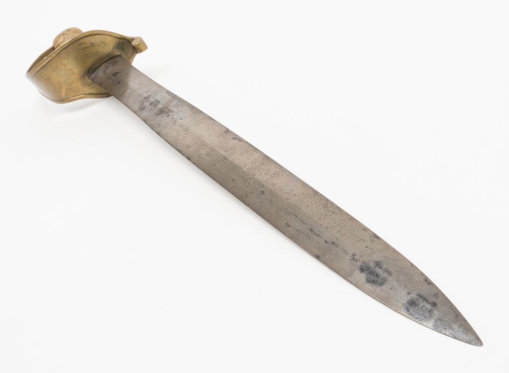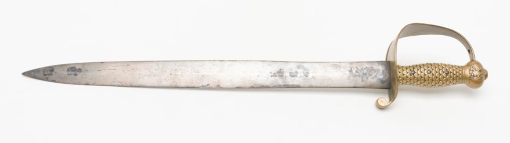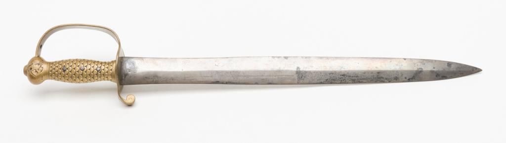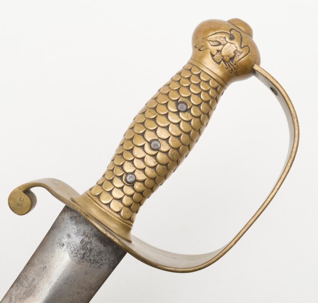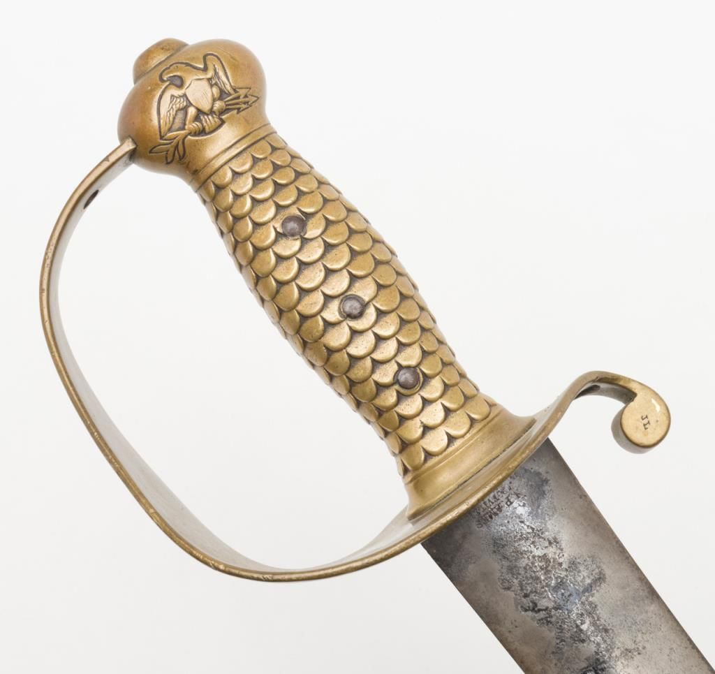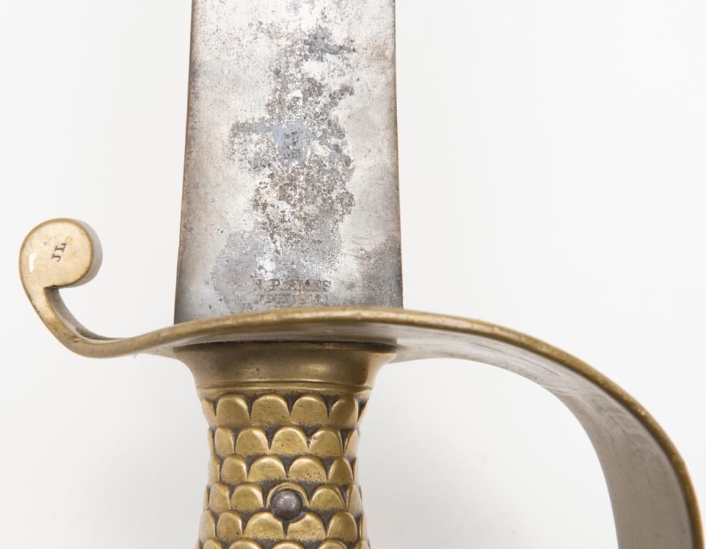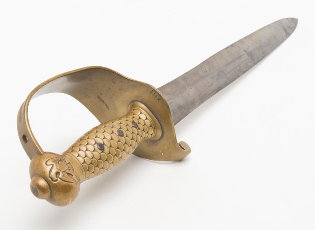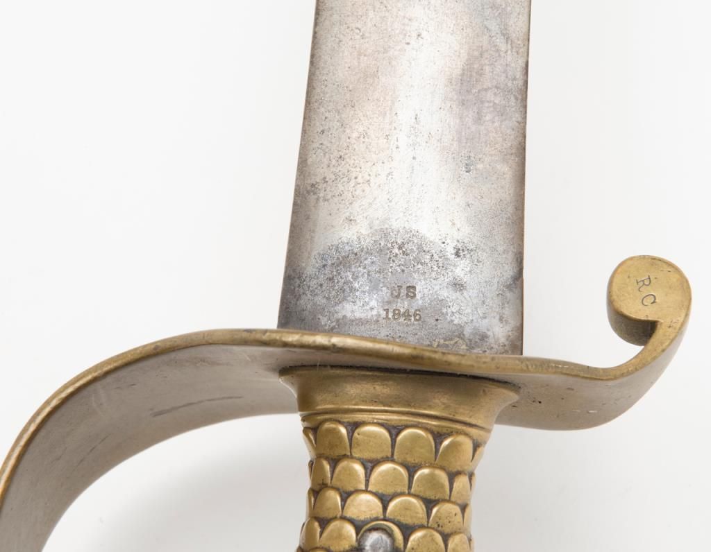 U.S. Model 1841 Naval Cutlass with 21” blade marked “N.P. Ames, Cabotville” and “US/1846” with “RC” on one side of the quillon and “JL” on the other; brass guard with “XIII” stamped on inside at scaled brass grip with eagle stamped on bothsides of the integral pommel (no scabbard); in overall very good condition with some scattered spots of erosion on blade. Est.: $600-$1,200.