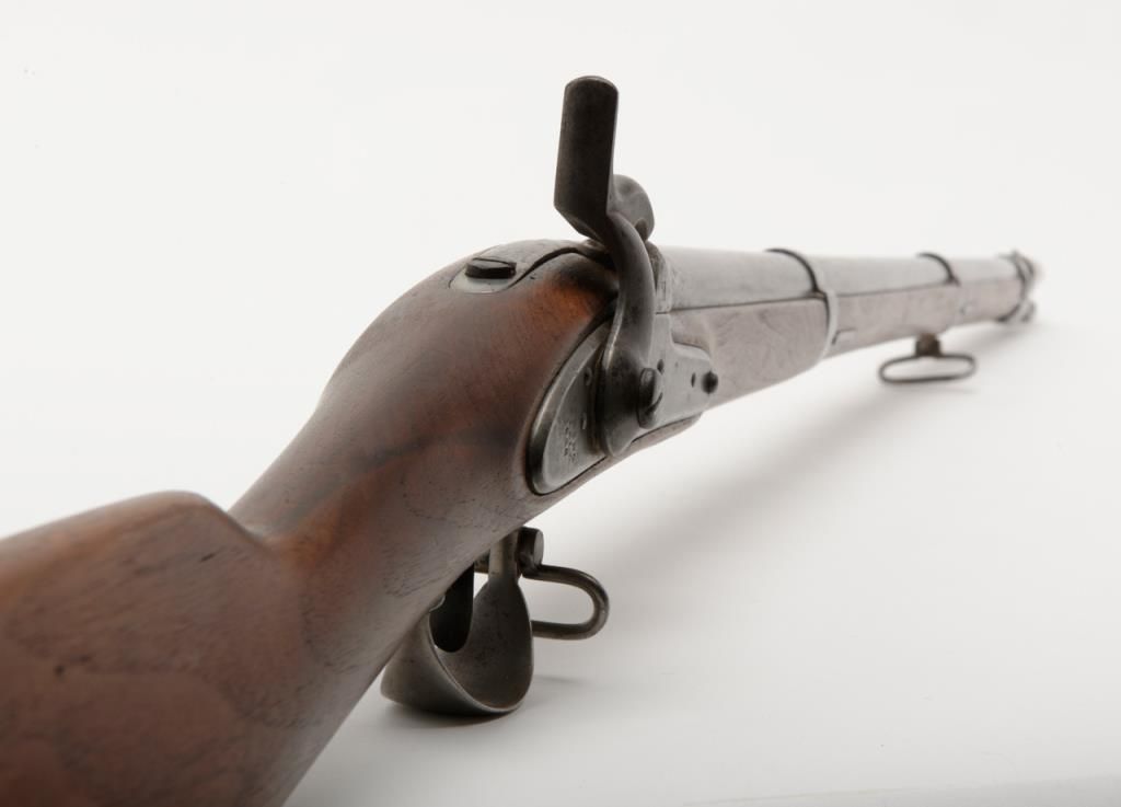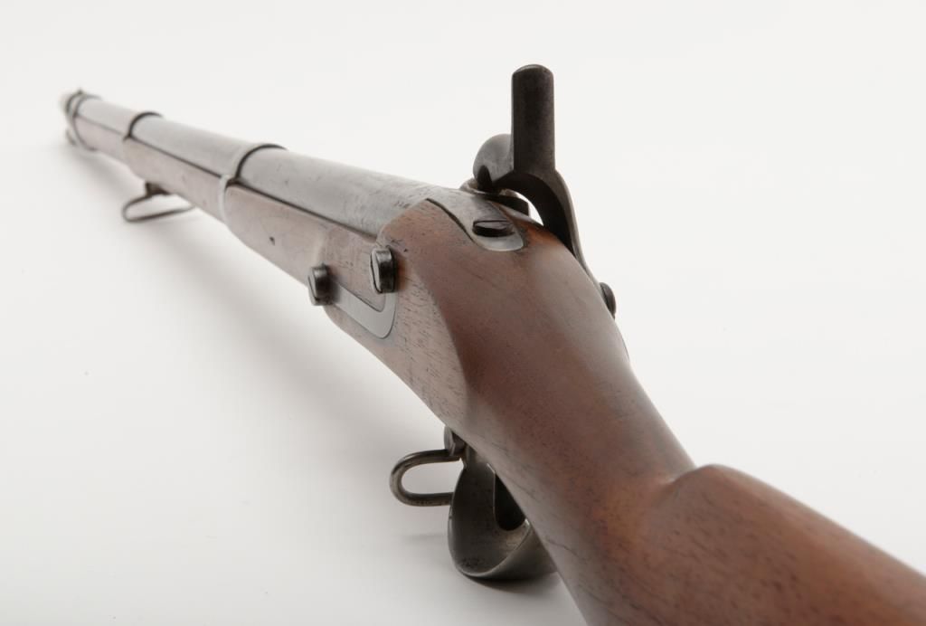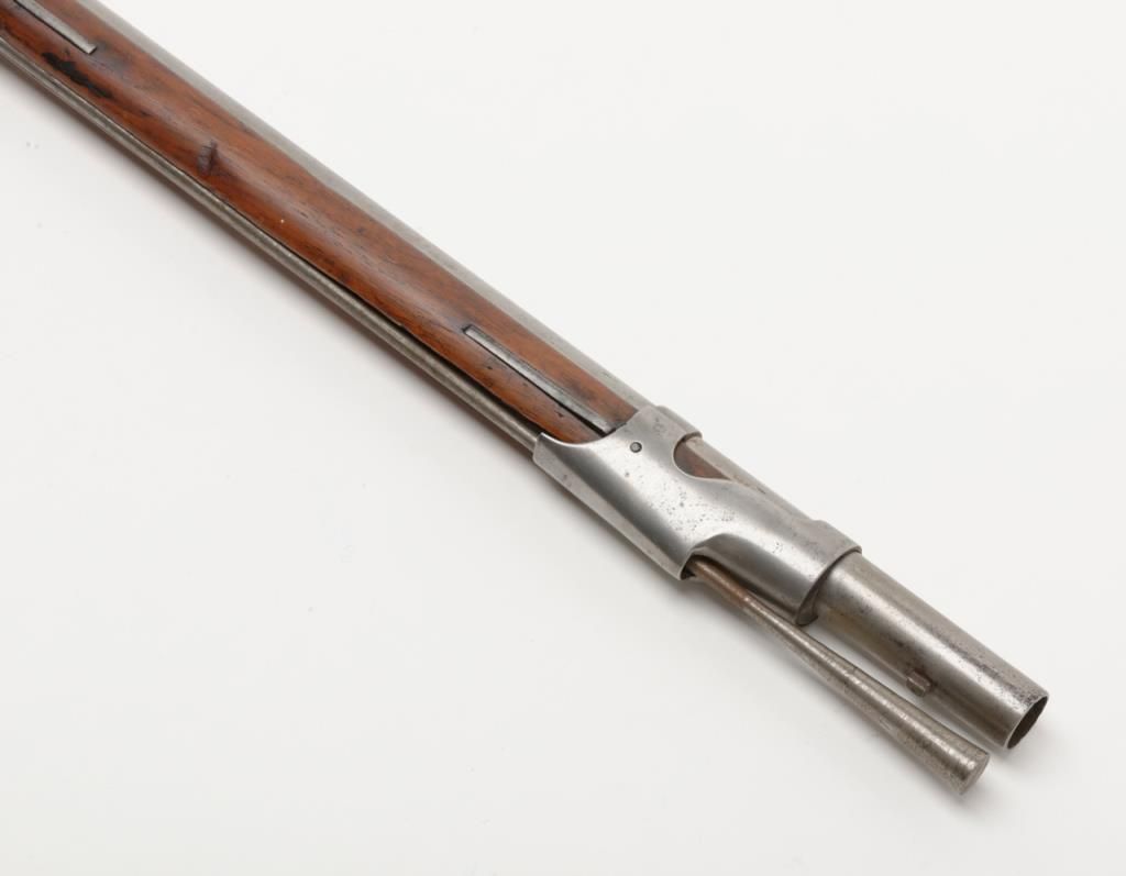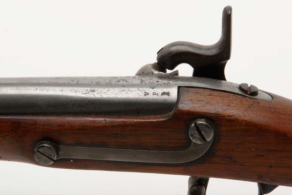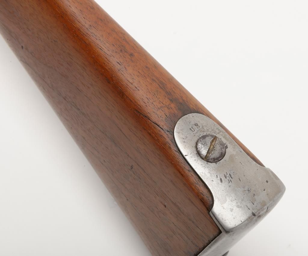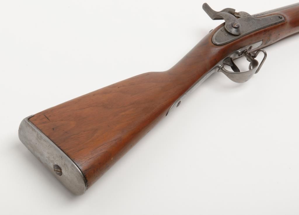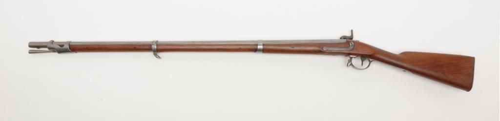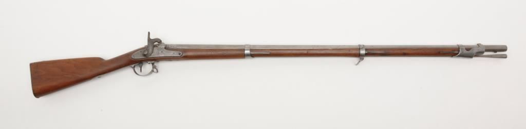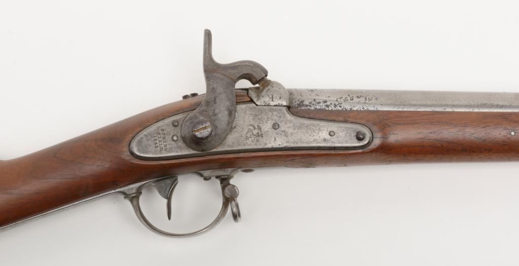 U.S. Model 1842 percussion musket in .69 caliber smoothbore with 42” barrel with lock of smaller size and dated 1848 on the rear portion. The bolster shows a reversed “K” which may be a company marking. The metal surfaces show somescattered pitting with some slightly heavy pitting in the area of the breech and on the hammer with a small amount of cleaning. The Eagle and Springfield are fully visible and well defined. The stock is good to very good also showing somecleaning and is slightly undersized against the metal. An original to the period ramrod is included. William A. Gary collection consigned by his estate. Est.: $1000-$2000