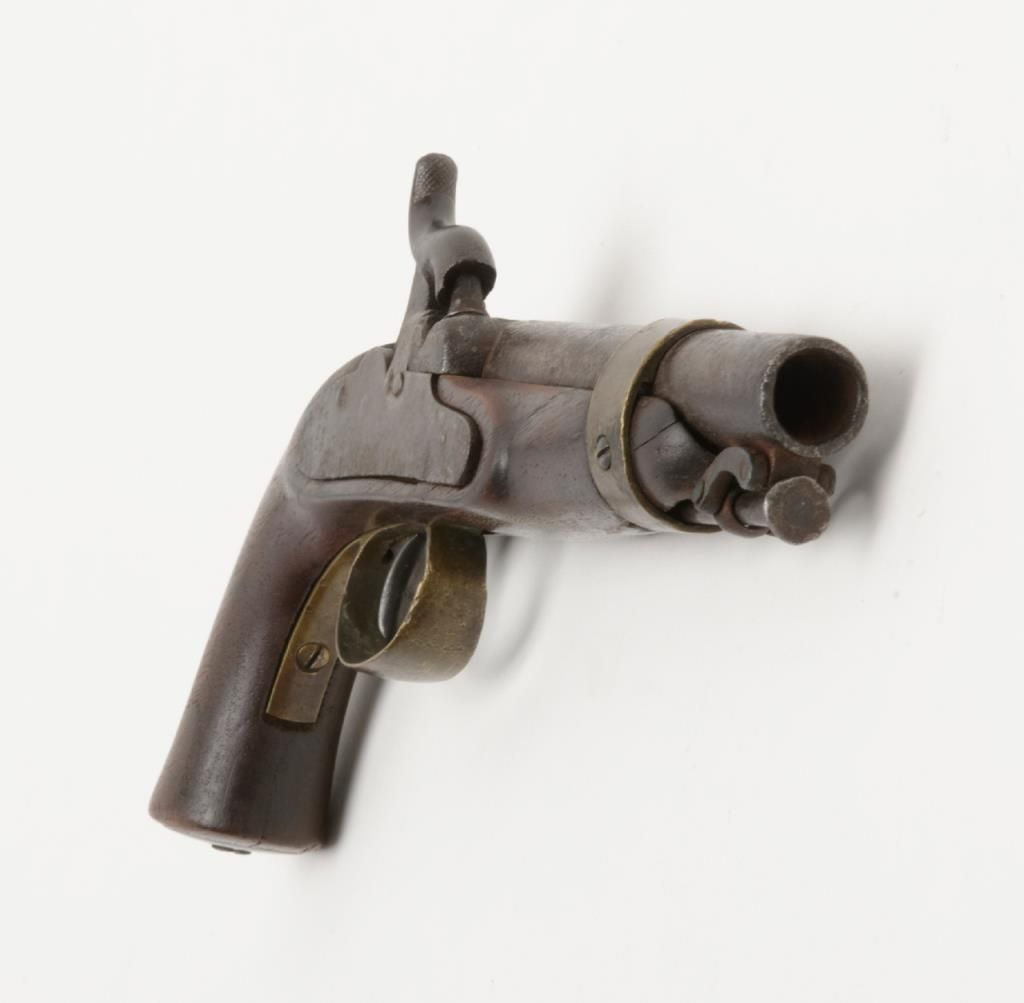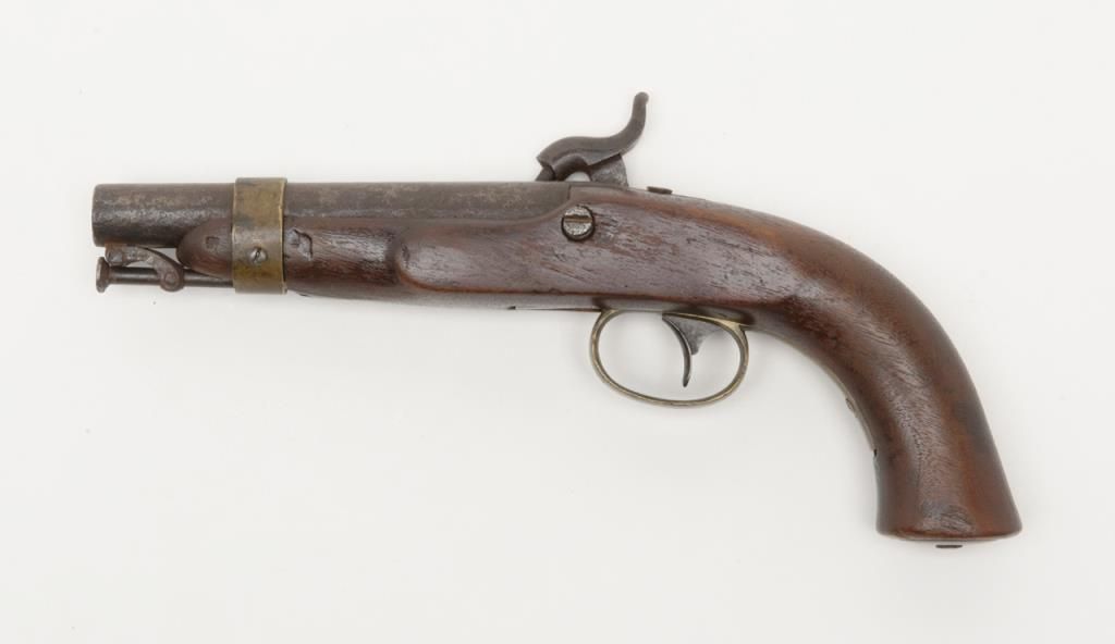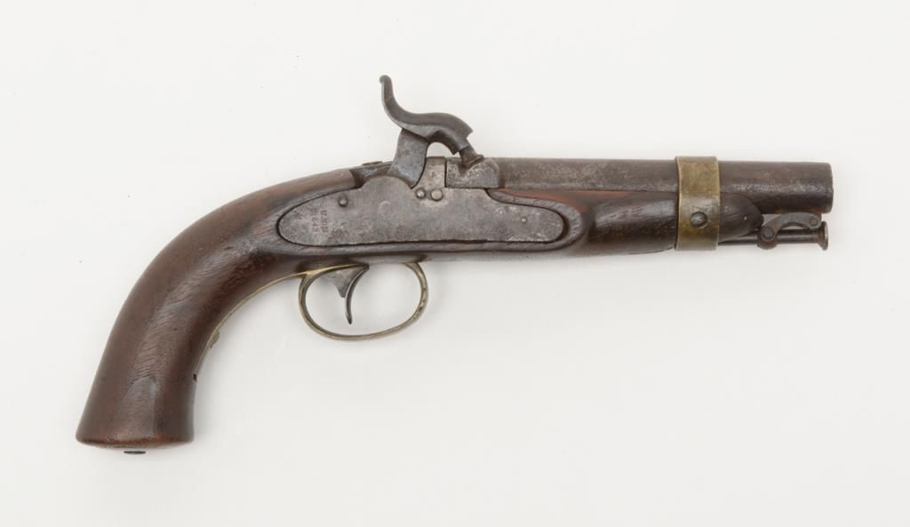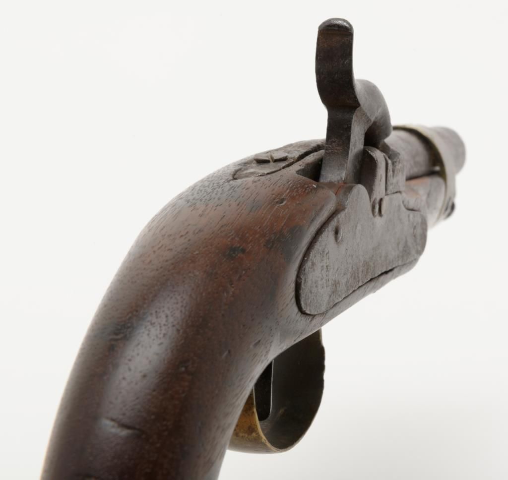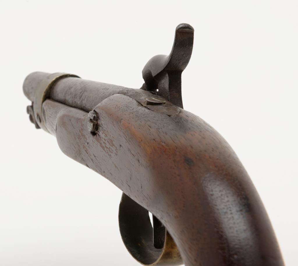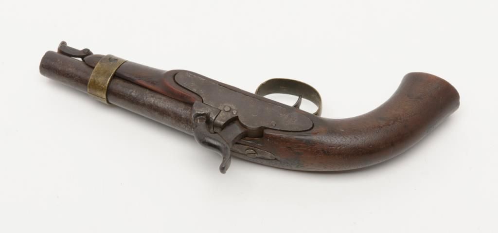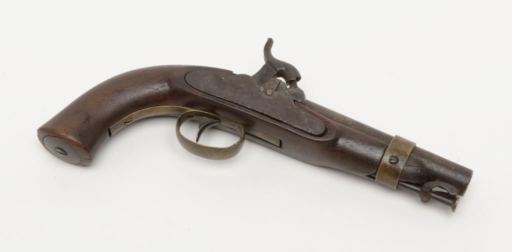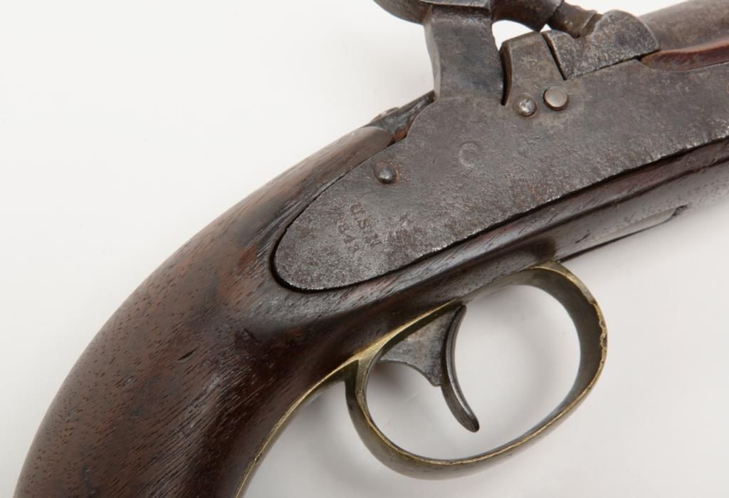 U.S. Model 1842 single shot box lock martial pistol by N.P. Ames with U.S.N. marking and 1842 at the rear area of the lock. The barrel is stamp J.C.R. over P on the left side of the breech. The metal surfaces show light to slightly heavyscattered pitting and erosion with tight associated with naval use. The stock is good with some light cleaning, small losses and a couple of cracks but generally good overall. The brass mounts show a dark patina. The ramrod and swivelappear original and the front edge of the hammer has been broken off and is missing. Refer Flayderman 6A-046. The collection of William A. Gary consigned by his estate. Est.: $600-$1200