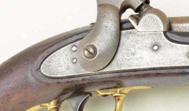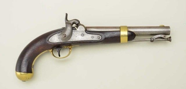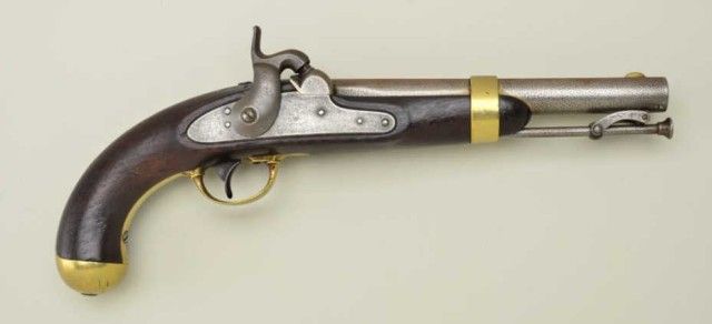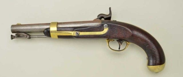 U.S. Model 1842 single shot percussion pistol  by H. Aston dated 1851 with all features as  standard issue on this model.  54 cal with  swivel ram rod and brass mounts.  The metal  surfaces show some light to moderate pitting.  The markings are visible.  The hammer screw  is a replacement.  The stock is good with  some small losses, minor wear and an outline  of cartouche.  Action is good.   From an old  N.Y. Collector’s Estate.  Est.;$600-$1,200.