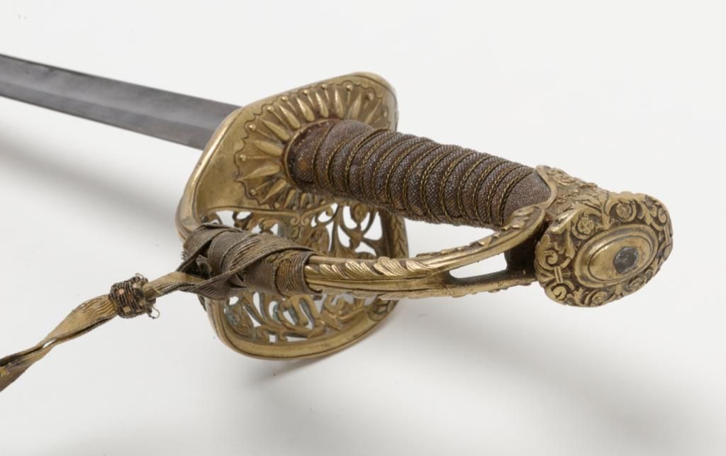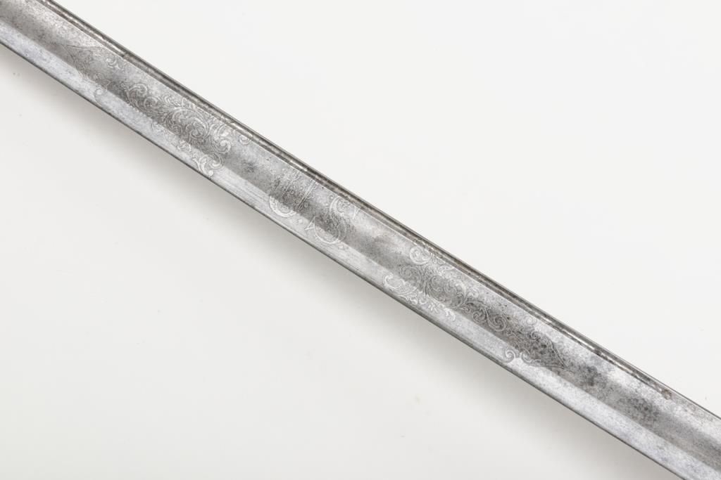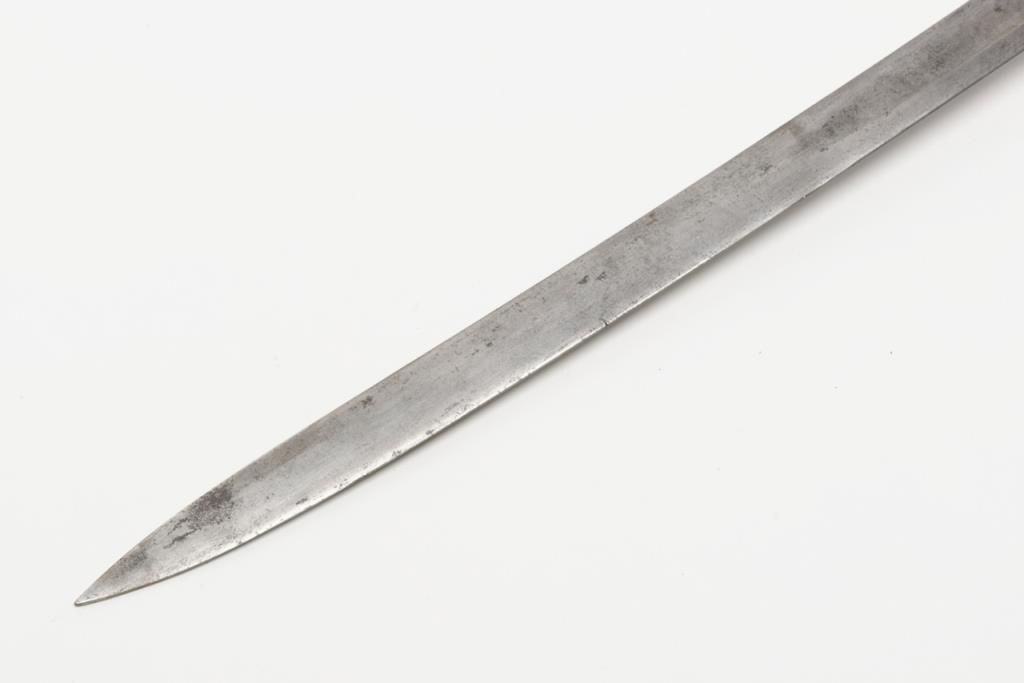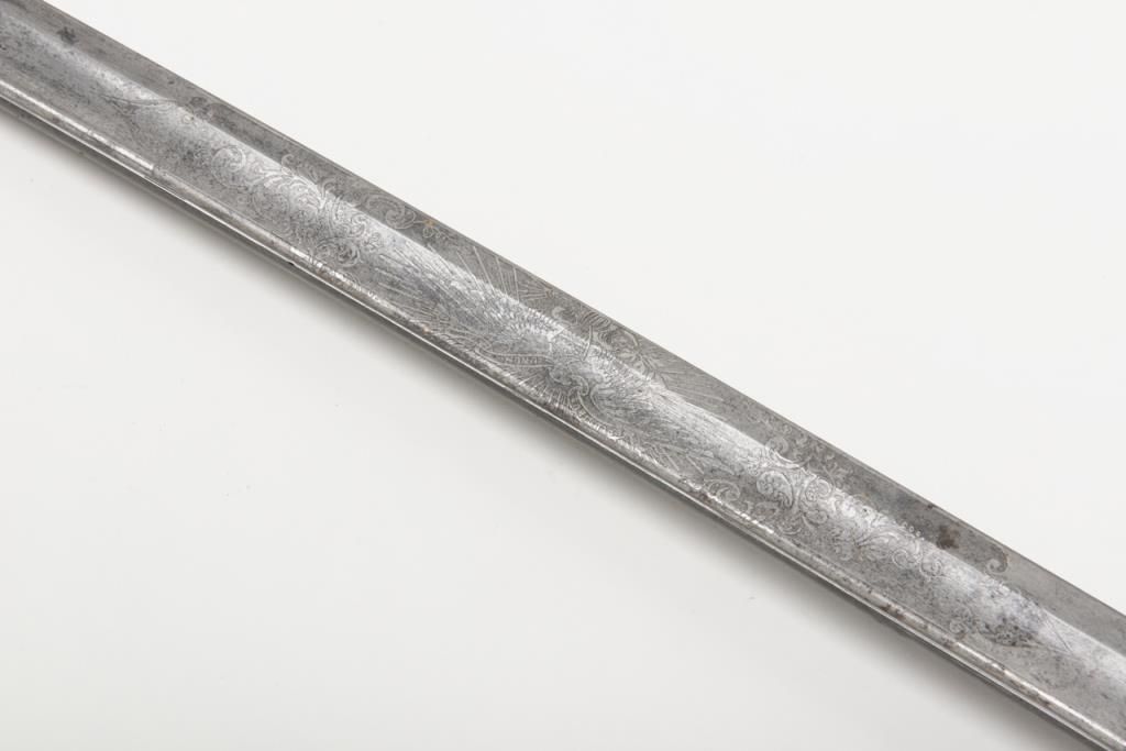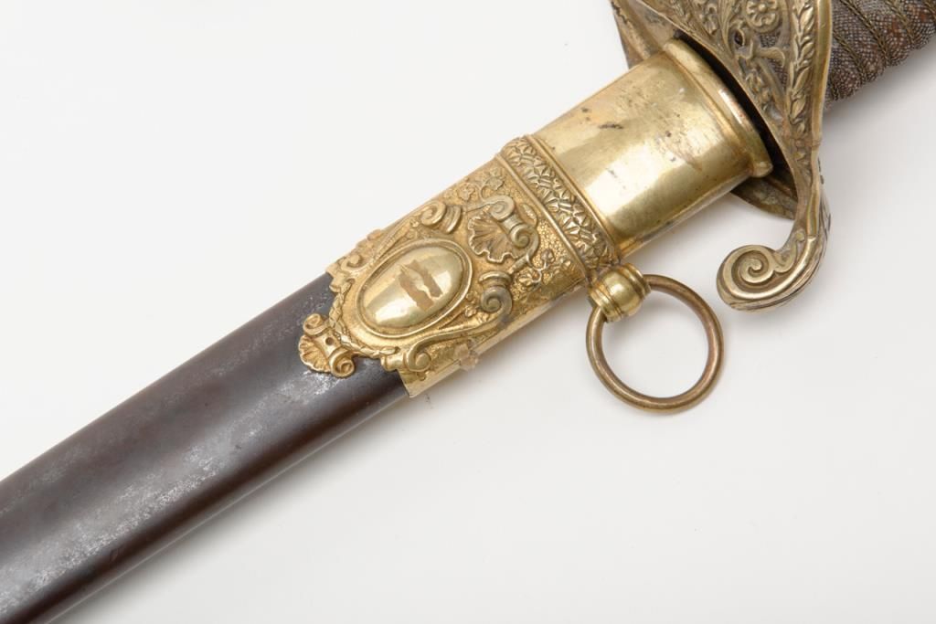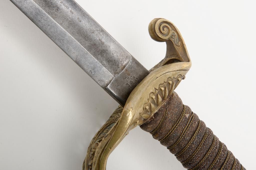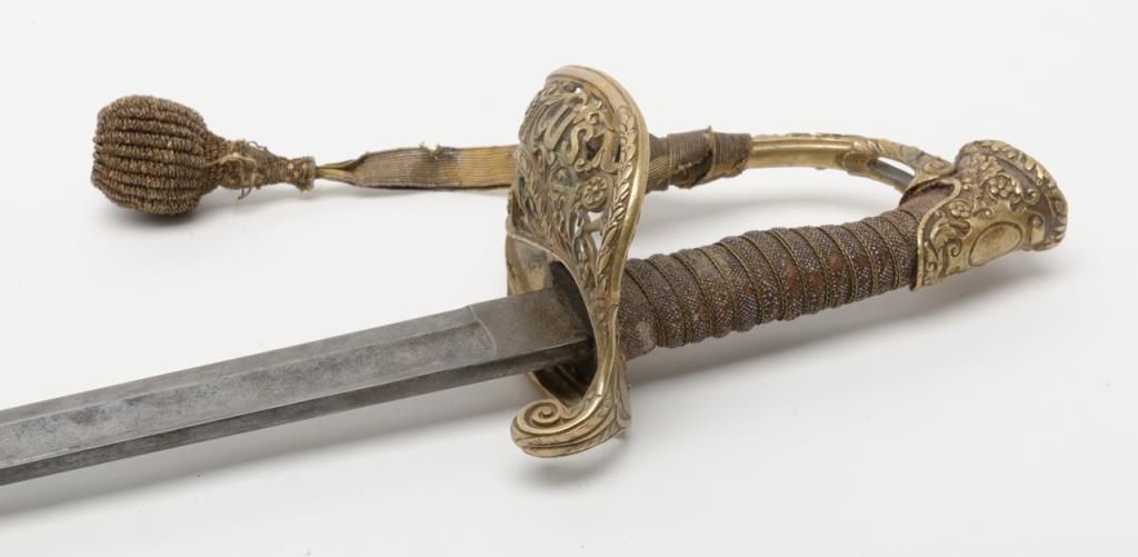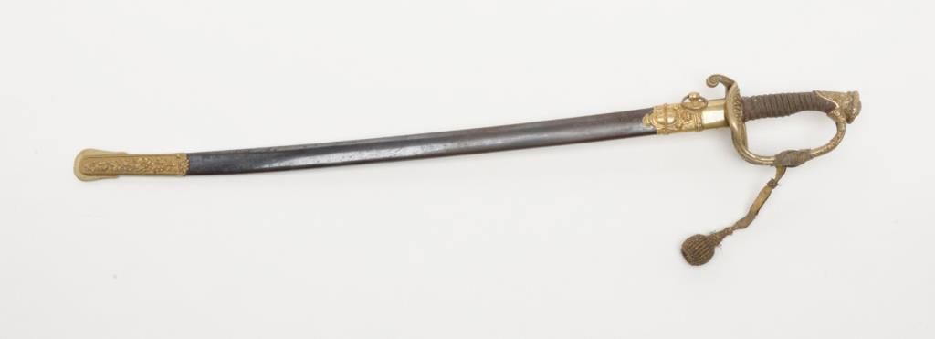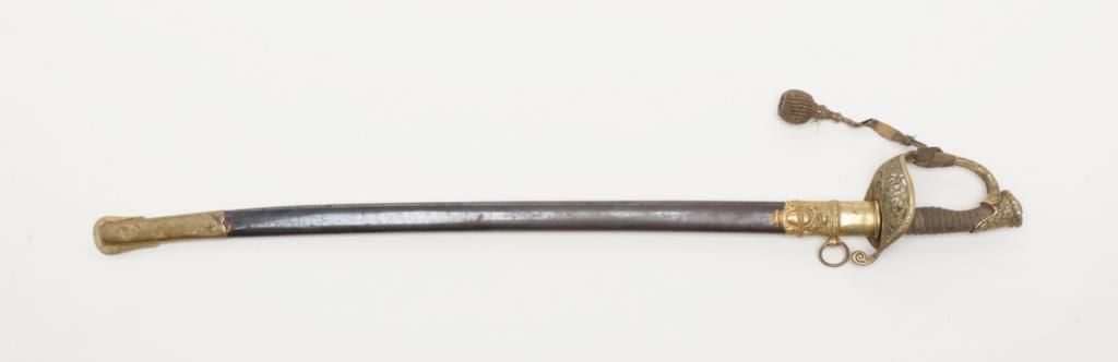 U.S. Model 1850 officer’s sword with fancy brass mounted scabbard and hilt period in script “Presented to Capt. Thomas C. Kendall by the members of Co., B. 21st New Jersey Vol., July 1st , 1863”. The hilt shows a serious bend in theguard but is otherwise good with sharkskin grip showing some minor wear and aging with slight losses and good tight brass wire wrap. The scabbard shows most of its original blue/brown finish with some minor scratches and normal aging. The blade shows a standard etched type U.S. with American Eagle and is in good condition with just normal aging and slight erosion. The blade shows a “Clauberg, Solingen” marking. The mounts and inscription are reversed indicating possible useby a left-handed officer. An authentic Civil War inscription that should be further researched as we have no information at time of cataloging. Est.: $2750-$5500