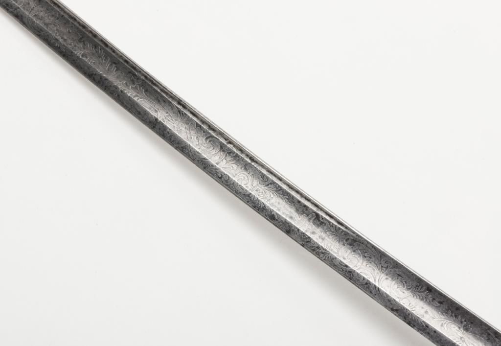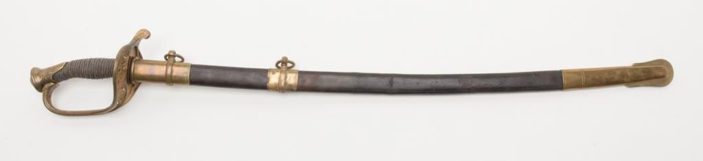 U.S. Model 1850 officer’s sword with original scabbard in good condition showing etched blade marked “Philadelphia”. The blade is in good condition showing some staining and normal aging but with most of the etching very visible. Thegrip is in good condition showing tightly wrapped sharkskin with just some minor edge wear and normal aging. The leather scabbard is good with small repairs and retains correct brass mounts and drag. A good example of the most used sword byUnion officers during the Civil War. Est.: $500-$1,000
