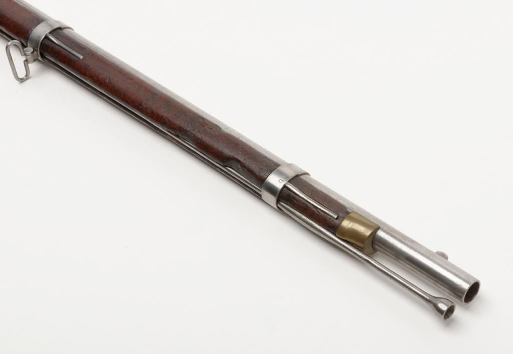 U.S. Model 1855, .58 caliber three band percussion rifled musket made by Springfield Armory with Maynard tape primer device and 40” round barrel. This rifle remains in good to very good original condition showing very sharp markings withbeautiful Eagle stamped at center portion of tape primer door. The lock and breech are dated 1858. The metal surfaces show light cleaning to bright with some original bright finish mixed in with polishing. The stock is fair to good with somelarge losses of wood in the front of the stock in the area of the ramrod channel and also some small dings, mars and scratches and some minor losses along top edge of stock where it meets the barrel. Also there is some wood filler in the left rearof butt stock. The spring is inside the tape primer mechanism and all parts are operating correctly. This rifle retains an original style ramrod. William A. Gary collection consigned by his estate. Est.: $2000-$4000