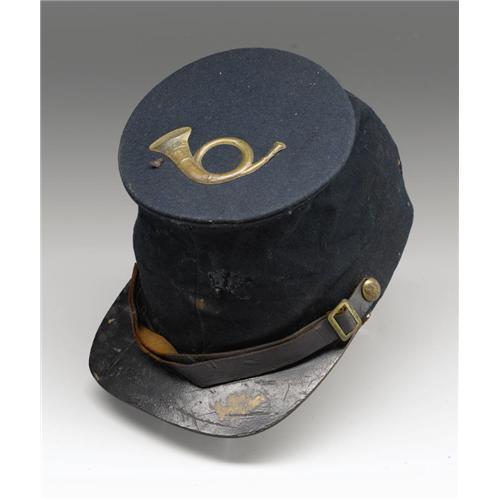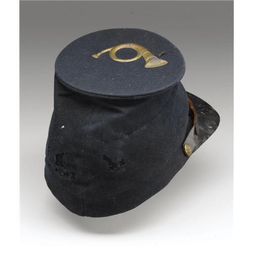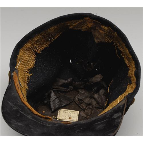 <B>U.S. Model 1858 Forage Cap With Original Label.</B></I> This 1858 Union forage cap has its original label intact. Made by 'L. J. & I. Phillips', the lining is missing and there is moth damage to the dark blue felt. With standard eagle buttons on each side, the leather of the cap is in fine condition with a nice patina. On the top there is a large bugle device in very good condition. The inside label gives the size (7 1/8) and 'U. S. Army' information.<BR><BR><b>Shipping:</b> Large Collectibles (<a target="_blank" href="http://www.heritageauctions.com/common/shipping.php">view shipping information</a>)