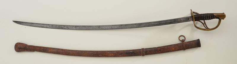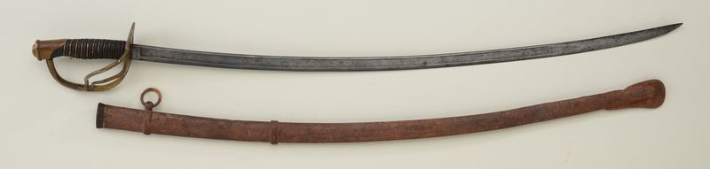 U.S. Model 1860 Cavalry Officer’s sword; maker’s mark too light to read (probably Ames), dated 1863; inspected by “_R. (first letter not legible); good overall with very good grip; scabbard is rusty and pitted;“343” in large numerals stamped on inside thread area of guard. Est.: $300-$600.