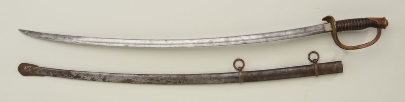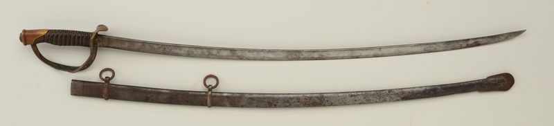 U.S. Model 1860 Cavalry saber by Ames dated 1863 and inspected by A.D.K. with scabbard; thumb area of guard is bent; some battle wear; missing throat and sword is tight in scabbard from bend; overall fair to goodcondition. Est.: $275-$550.