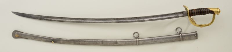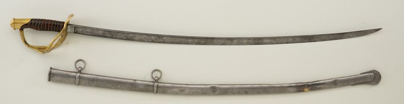 U.S. Model 1860 Cavalry sword by Ames dated 1865 with inspection by G.K.C. with scabbard; some dents to guard from carry or battle but good to very good overall with only slightly light markings; scabbard dented with braised old repair; a classic old battle veteran of the Civil War. Est.: $300-$600.