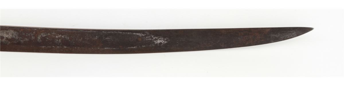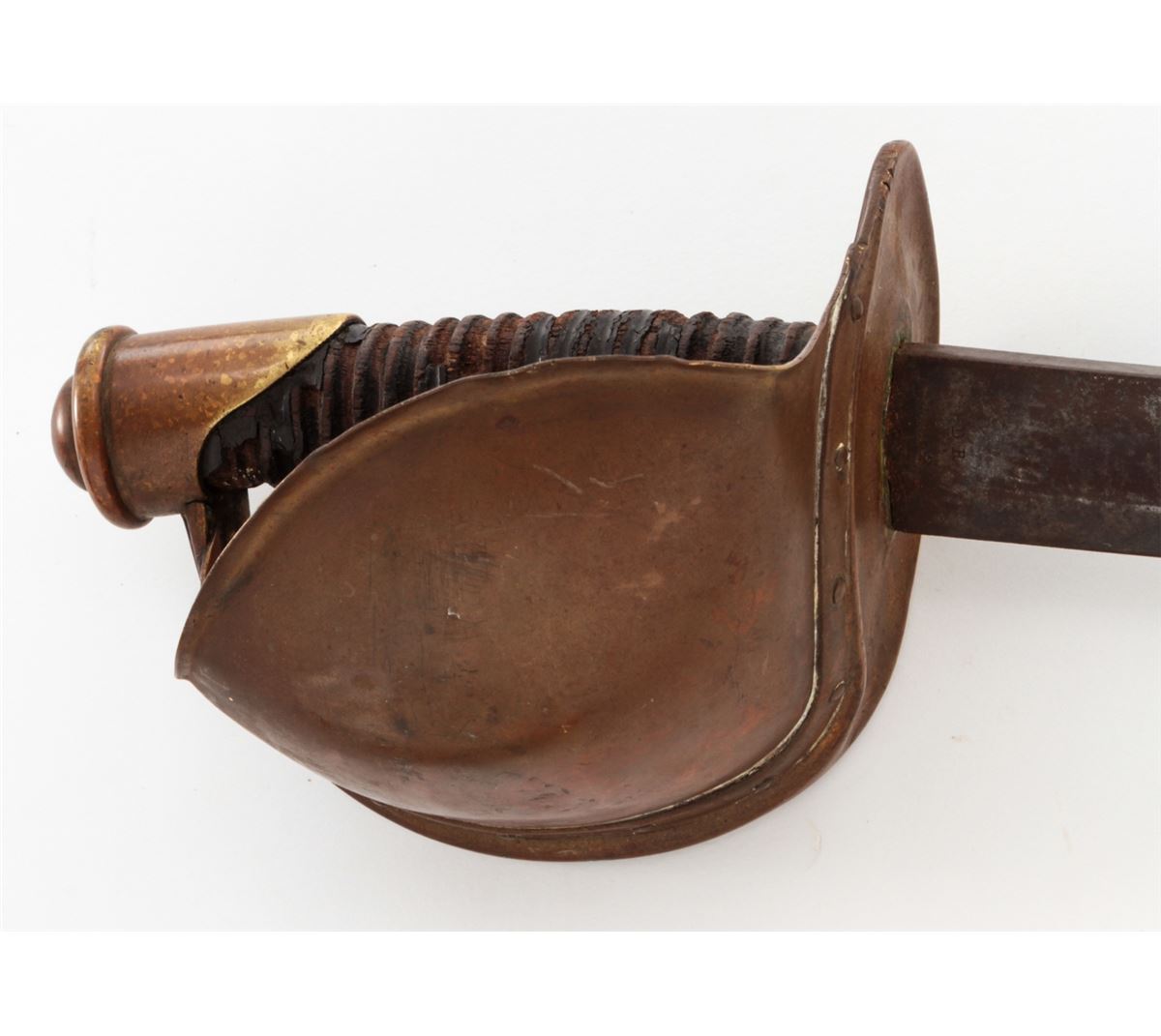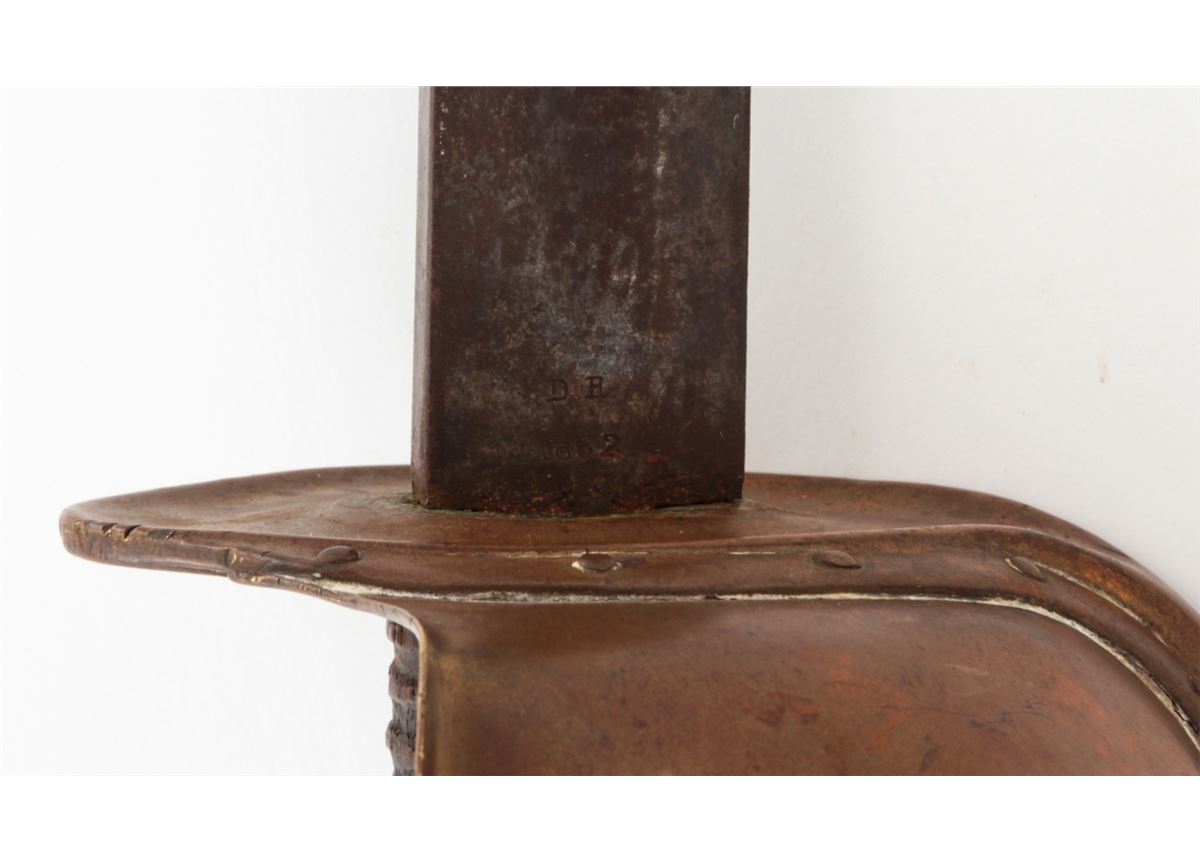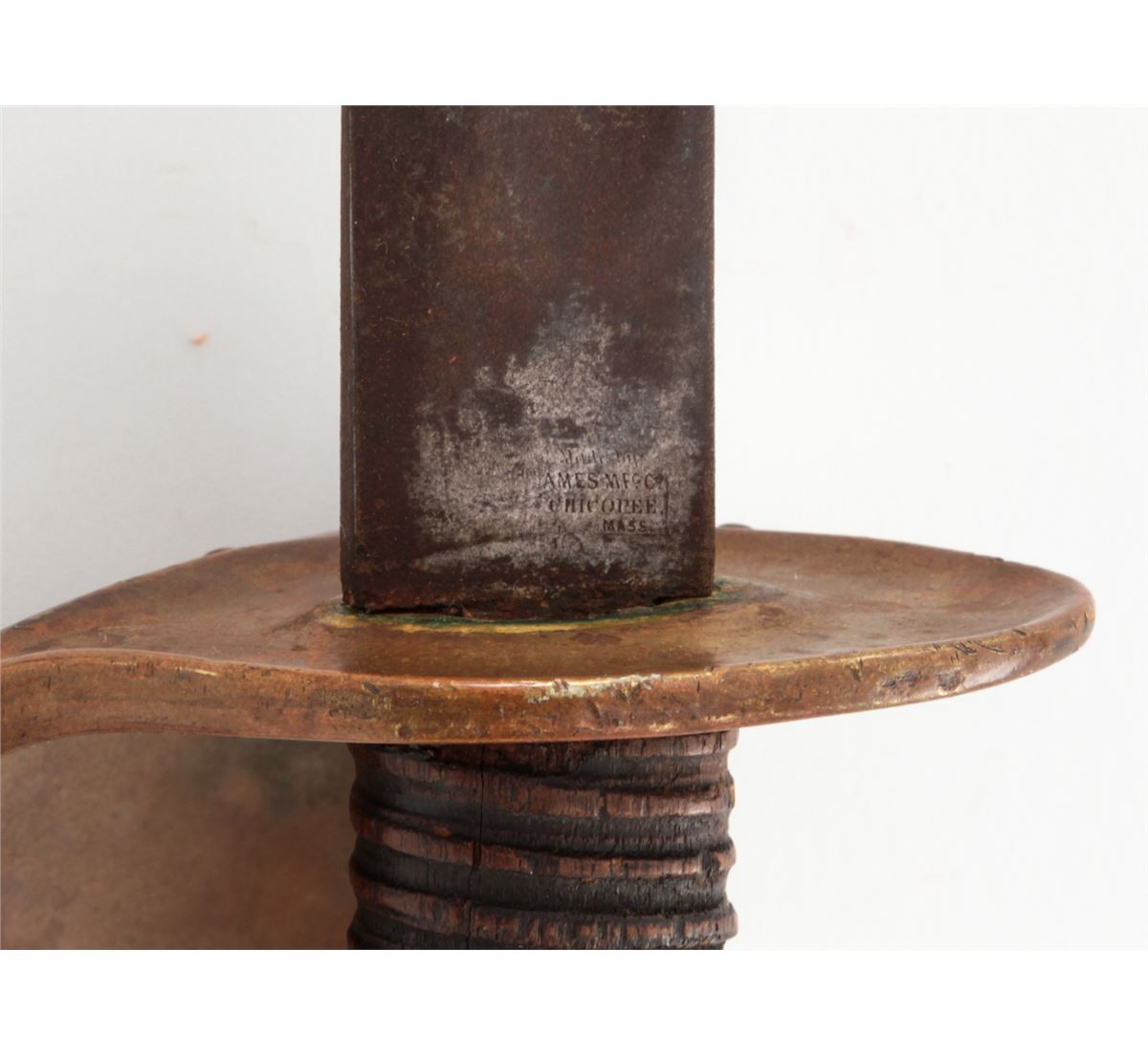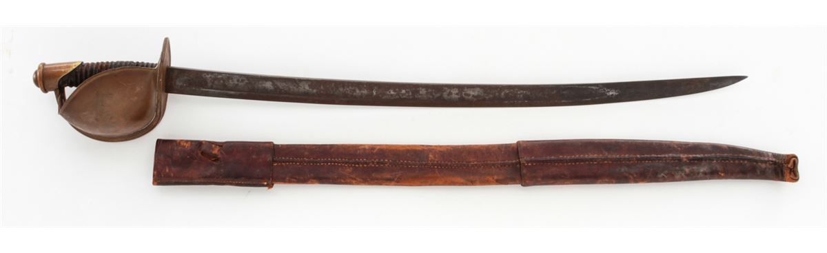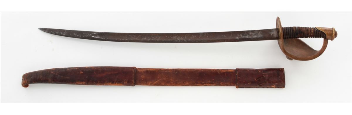 U.S. Model 1860 Naval Boarding Cutlass, by Ames, 26'' blade, 32'' overall, with brass cupped guard and pommel, and originally with leather wrapped wood handle. Blade marked ''D.R./1862''; top of crossguard marked ''15M/32''. Condition is good. Wire wrap to grip is missing. Leather shows some traces in grooves. Even moderate patination to handguard, with moderate corrosion to blue blade. Brown leather scabbard shows oil darkening and loss to tip. Est.: $300-$500.