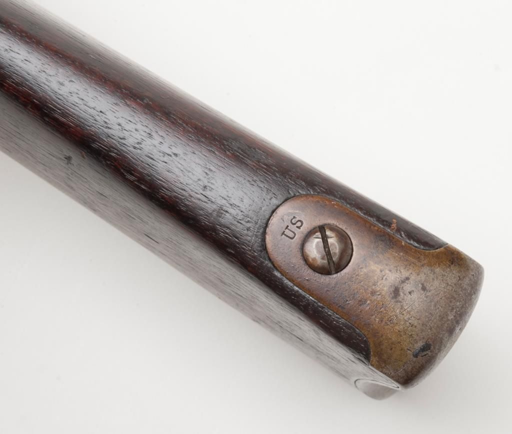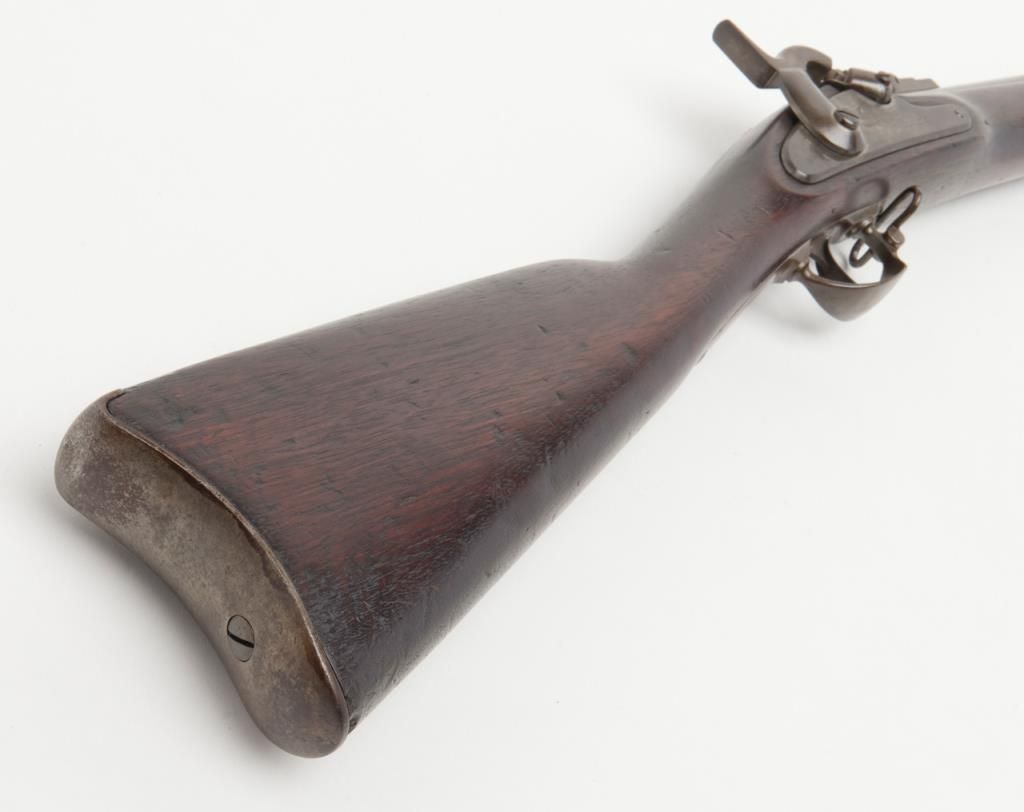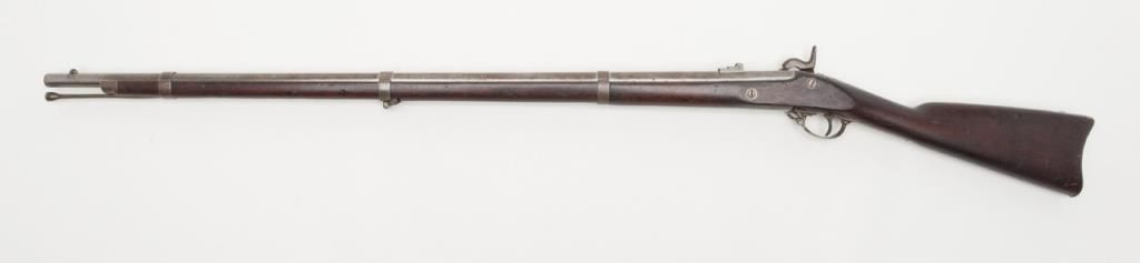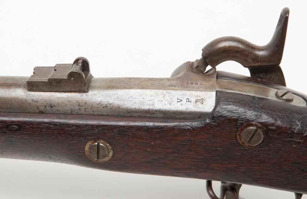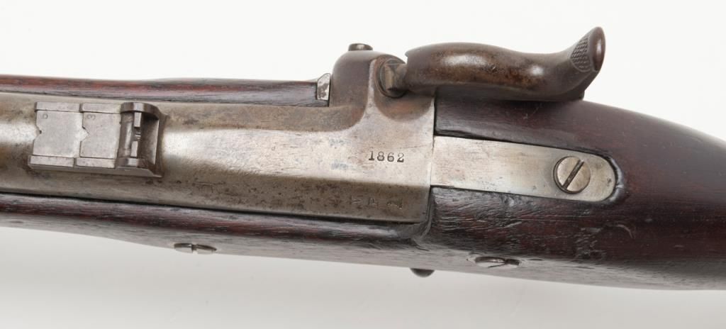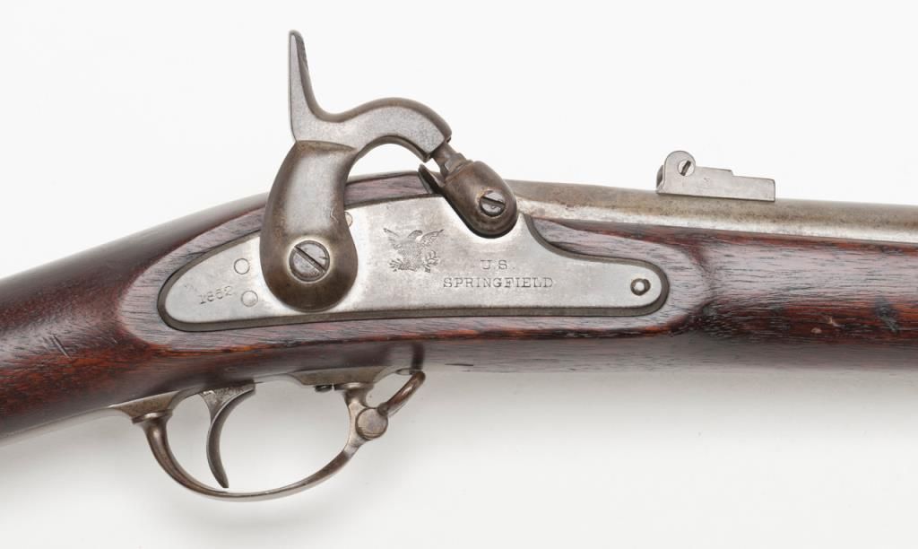 U.S. Model 1861, .58 caliber rifled musket by Springfield Arsenal in good condition with bayonet and ramrod. Dated 1862 at breech. Good clear markings and Eagle stamp on lock. Minor erosion and surface pitting with just slight metal aging.The stocks are good but show no cartouches and some darkening, minor dings, mars, scratches and just normal aging. Lock works well. The bore is fair to good with strong rifling. Est.: $1000-$2000