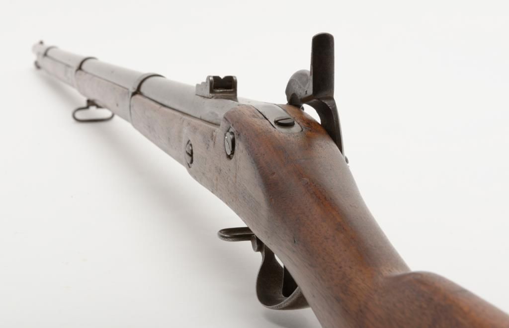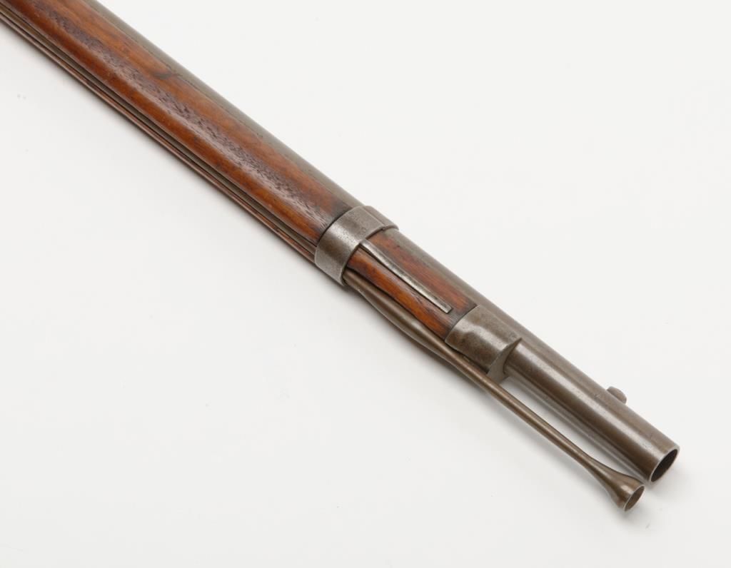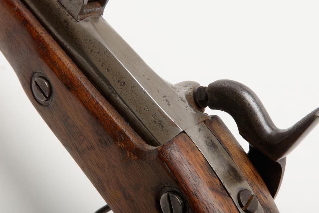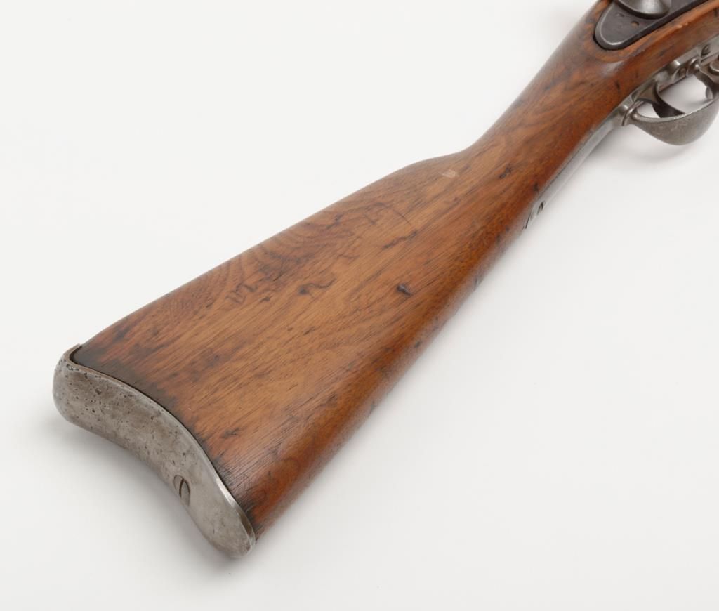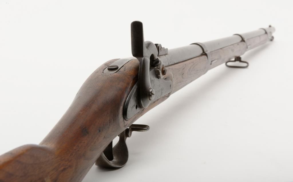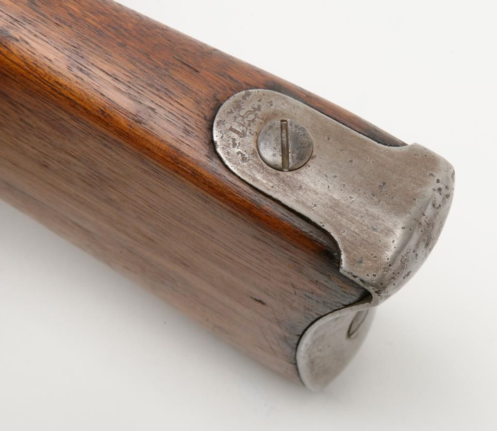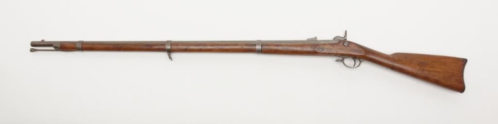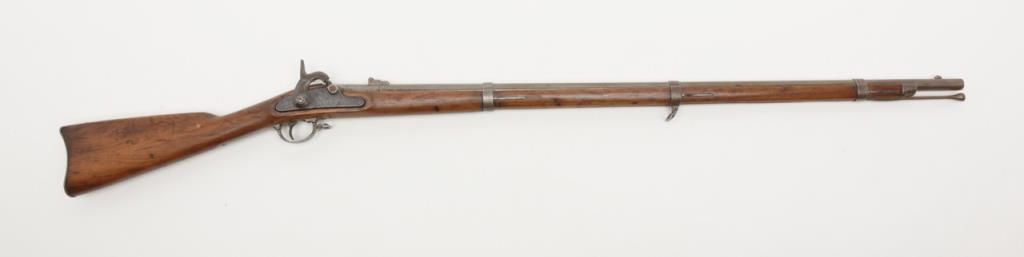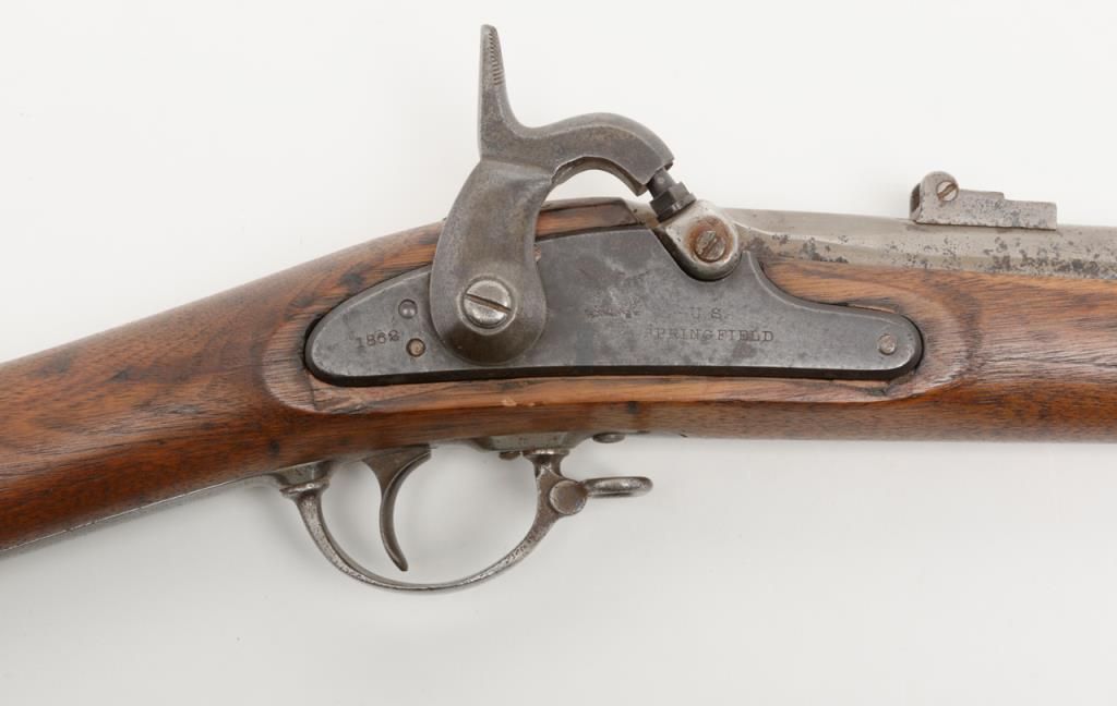 U.S. Model 1861, .58 caliber rifled musket dated 1862 on the lock remaining in good condition. The metal surfaces show a light gray to brown patina finish with some scattered light to moderate erosion and pitting and some cleaning andre-coloring on the barrel (minor restoration). The lock plate shows good markings and 75% of the Eagle stamp. The stock is good with some minor losses along the ramrod channel, a couple of dings, mars, scratches, light cleaning and sanding with a small area of repair and replacement of wood around the lock area (minor wood restoration). The stock shows two mostly visible original cartouches. The original swivels, sights and small parts are all retained. The nipple is an old replacement. The action is good and the bore shows some firing. The rifling is shallow and an original ramrod is retained. William A. Gary collection consigned by his estate. Est.: $900-$1800