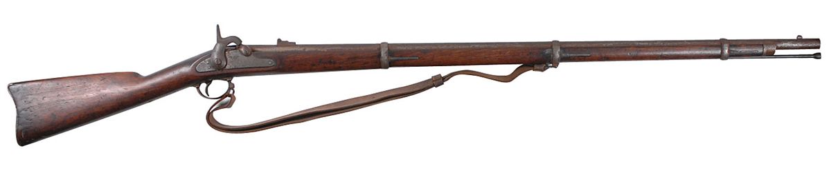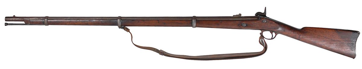 The 40? barrel has been bored smooth and is now approximately .60 caliber. The lockplate is dated “1864” and marked “U. S./Springfield,” the barrel has no legible date or proofmarks. The left side of the stock has a stamped number “55111” and a faint “ESA” inspector’s cartouche. Most of the barrel has a dark patina with some surface rust along the stock line. The lockplate is a mottled gray with scattered small spots of surface rust. The stock has a short grain crack behind the top tang and retains most of an old refinish that shows light handling marks. This Springfield retains the original steel ramrod, and remarkably has an original brown leather sling in fine condition.
