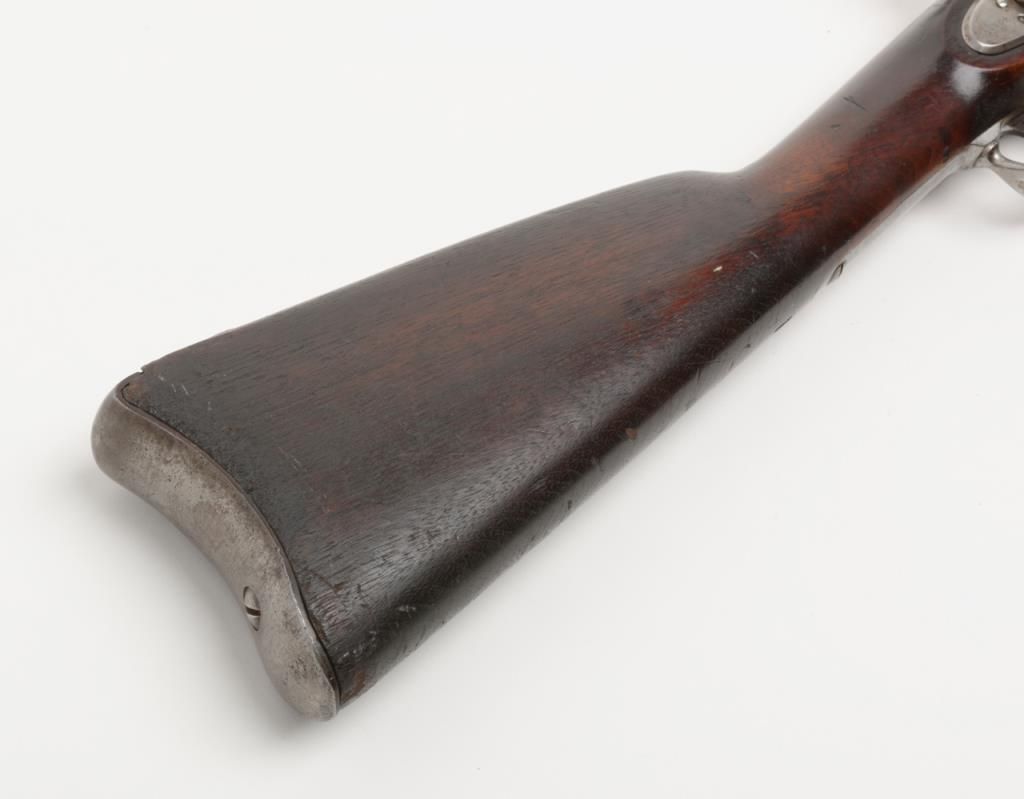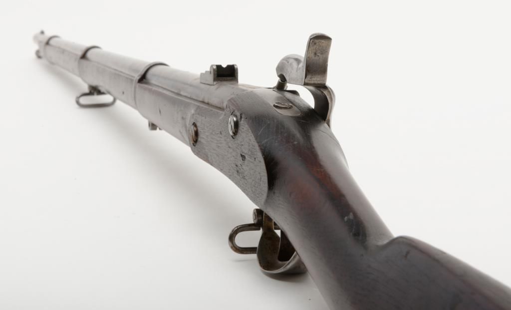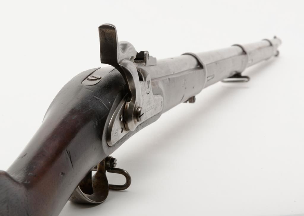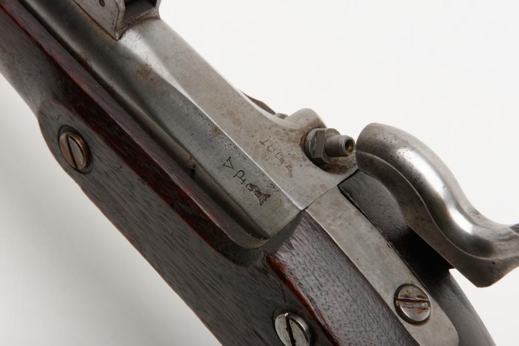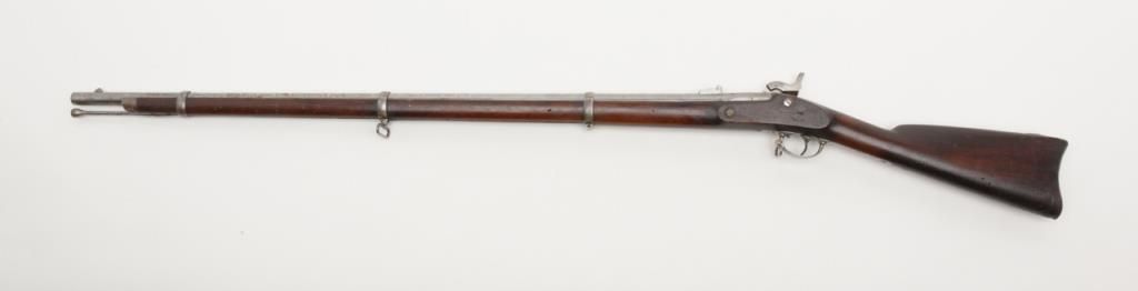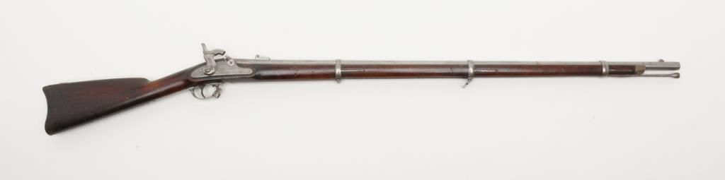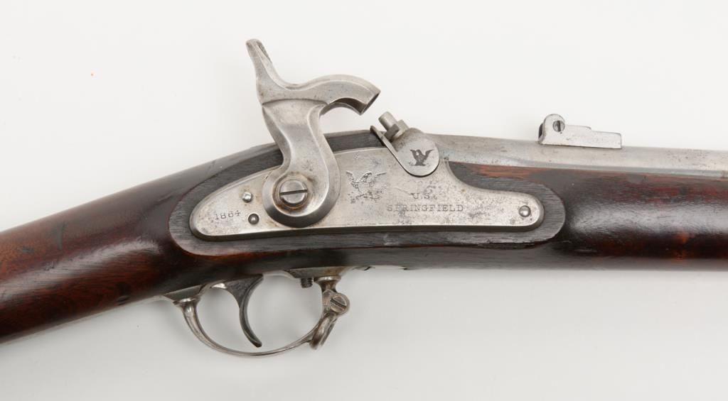 U.S. Model 1863, .58 caliber rifled musket by Springfield Armory dated 1864 remaining in very good plus to near fine original condition. The metal surfaces show considerable original bright arsenal polish with some light cleaning that hasbeen professionally done. There is slight beginning staining and minor beginning rust. The markings are very sharp and clear with good Eagle markings on both lock and bolster. The breech shows 1864 date along with the P and Eagle proofsall of which are good and sharp. The sight shows original quenched blue arsenal finish. The stock is also very good plus to near fine with some storage type dings, minor mars, scratches and only a few very minor losses along the ramrod channel. There are also a few bruises and bumps around the butt plate area. The stock shows two good clear cartouches on the left side above the trigger. The bore is sharp with crisp rifling. There is a small inspector stamp behind the trigger guard.William A. Gary collection consigned by his estate. Est.: $1500-$3000