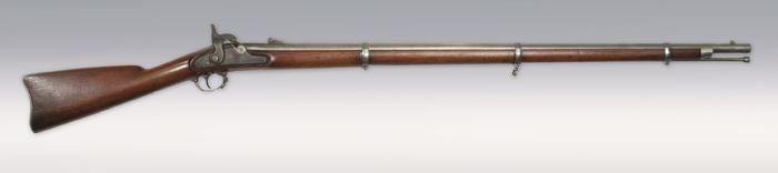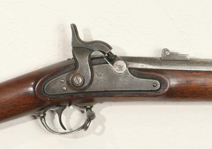 U.S. Model 1863 Type II Springfield Civil War Musket. 56" long. .58 Calibre. Lock dated 1864. Excellent example of Civil War Musket. Condition Report: Double cartouche. Excellent stocks. Inspector marks on metal parts. Original barrel band. Original sight. Case colors remaining on hammer. Lock plate retains traces of blue. Original ramrod. Overall excellent condition. Excellent mechanics. Good bore. Good wood with cartouche. Barrel shows some pitting by breech.