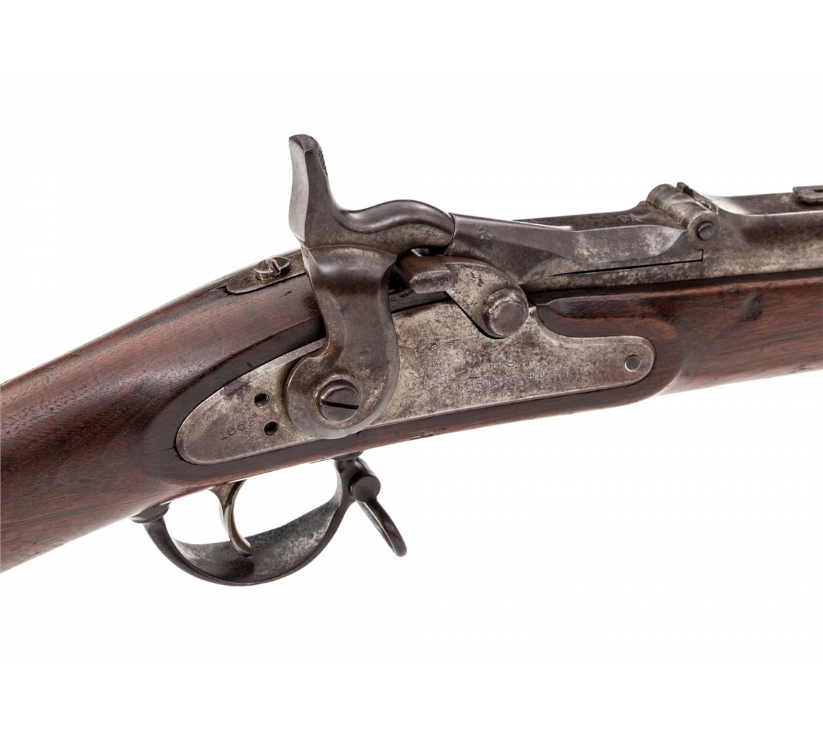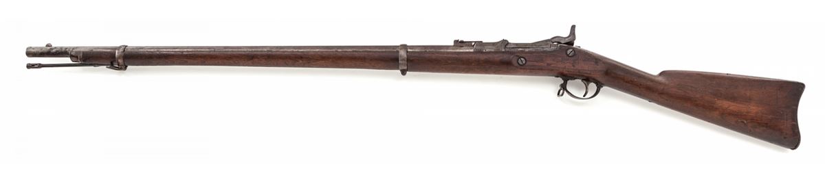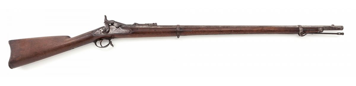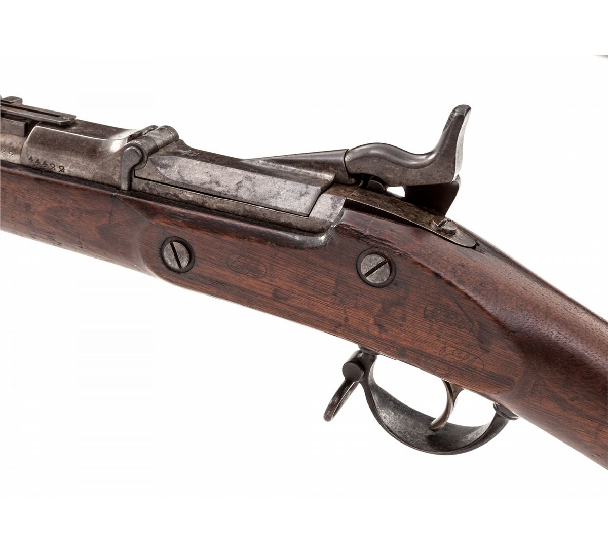 U.S. Model 1868 Trapdoor Rifle, by Springfield, #44422, .50-70 cal., 32-1/2'' barrel, long range type rear sight with adjustable sight leaf, front sight on lug that serves as bayonet stud, 1863 dated lockplate with Federal eagle, 1870 dated breechblock, full-length walnut stock with four cartouches. These rifles were mfg'd from 1868-1872. Condition is very good with overall gray patination. Stock with scuffs and oil darkening and fracture emanating from left side forward lockplate screw that detracts little; stock shows losses to left side of upper tang as well. Action is good, bore is about fine with some areas of pitting. Est.: $1,200-$1,800. (Antique)