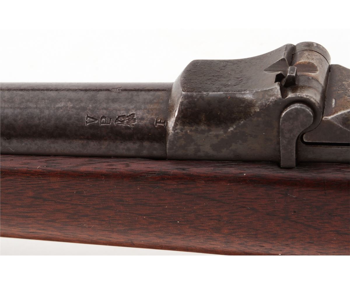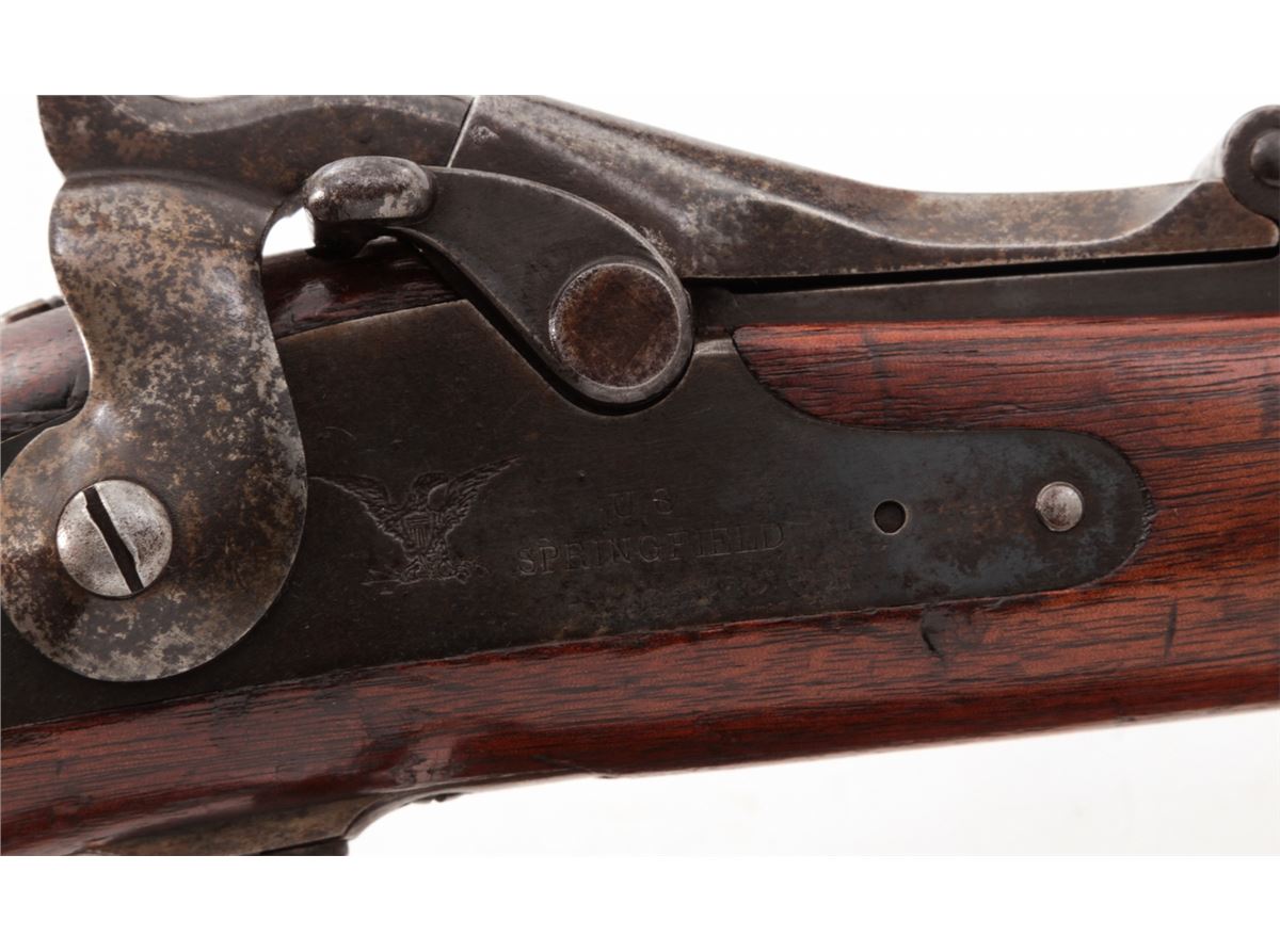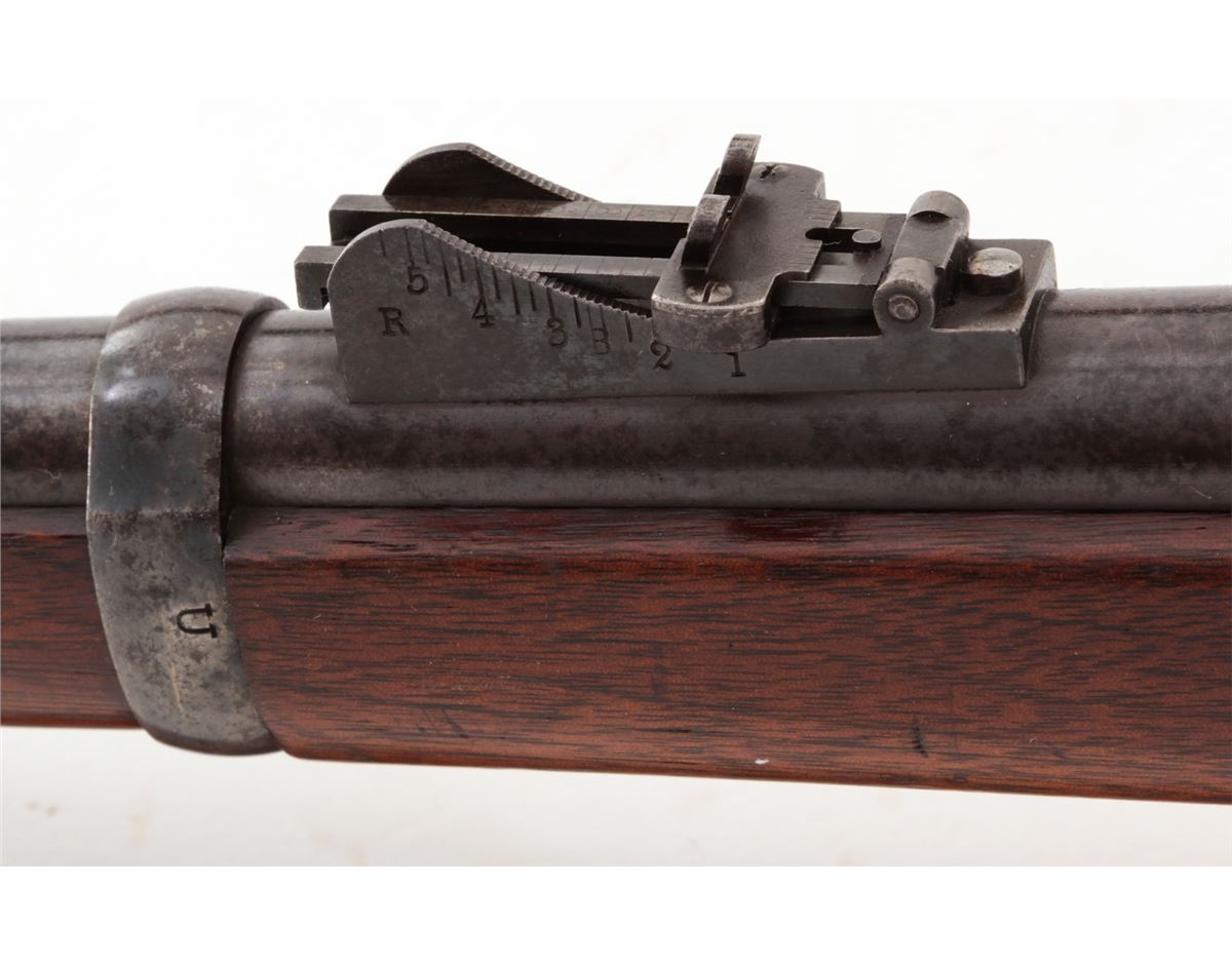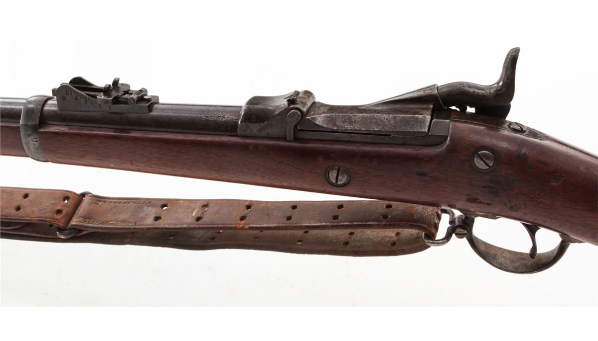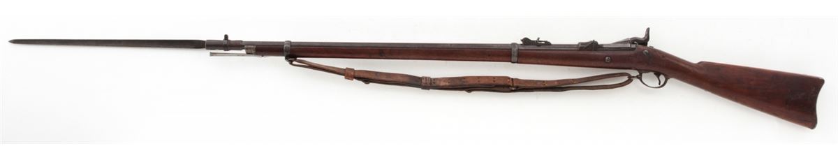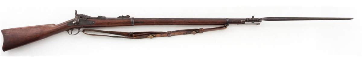 U.S. Model 1879 Trapdoor Single Shot Rifle, by Springfield, #281207, .45-70 cal., 32'' barrel, blue and case hardened finish, cartouched walnut stock, with bayonet and leather sling. Condition is very good retaining approx. 85% finish. Stock with moderate scuffs, relatively clear cartouche. Action is good, bore is fine. Est.: $1,000-$1,500. (Antique)