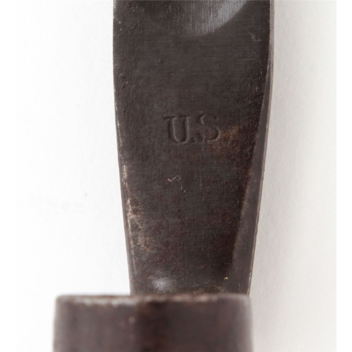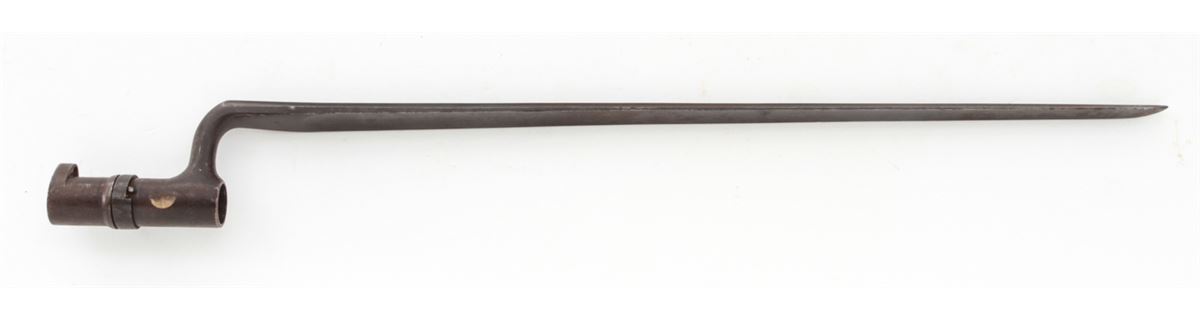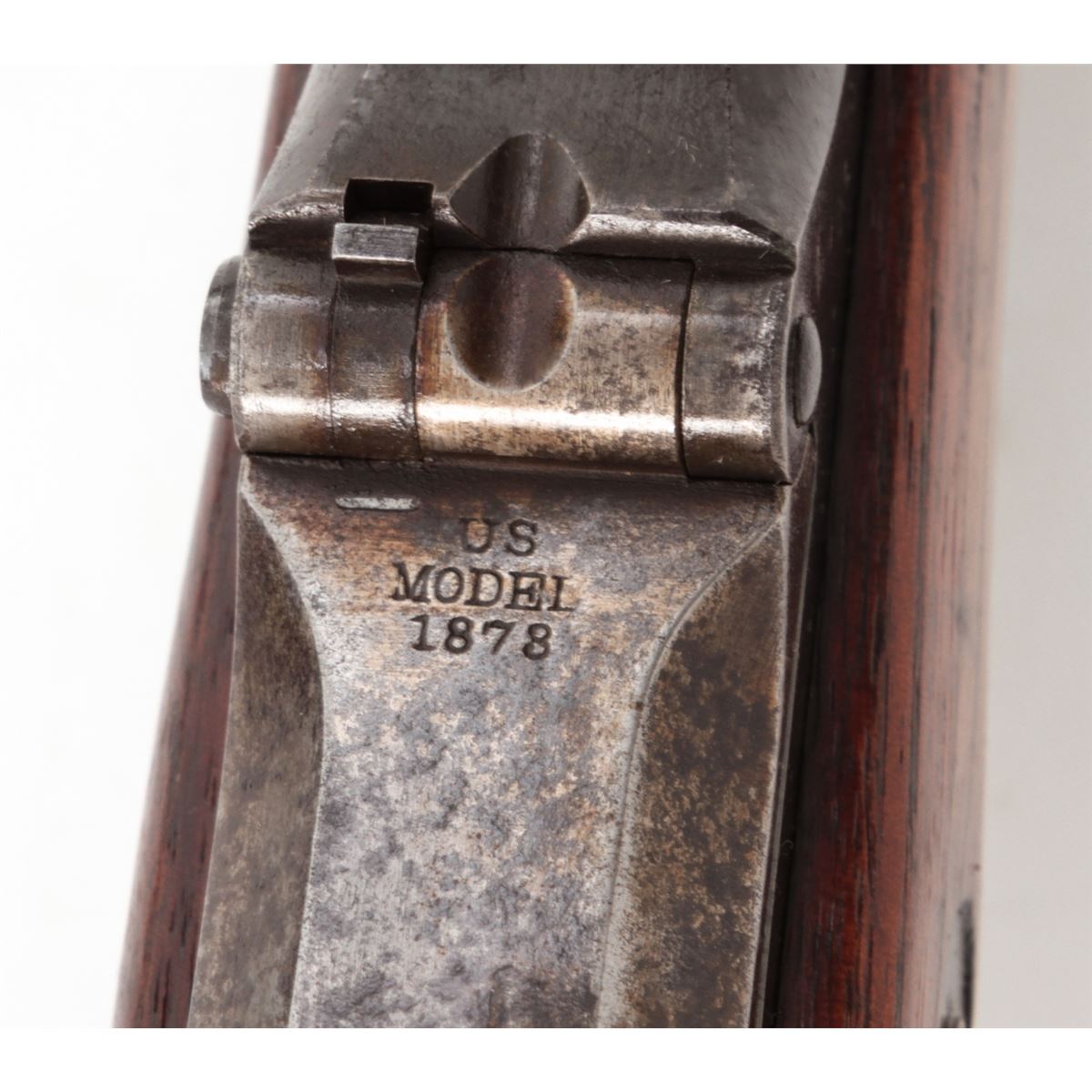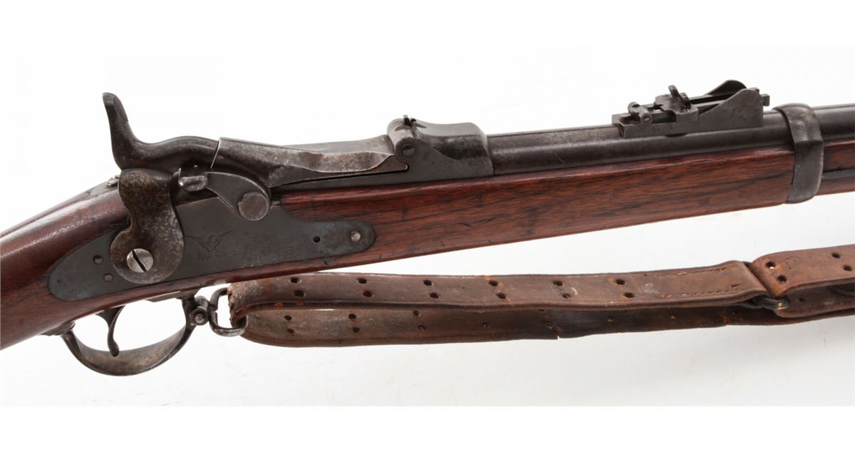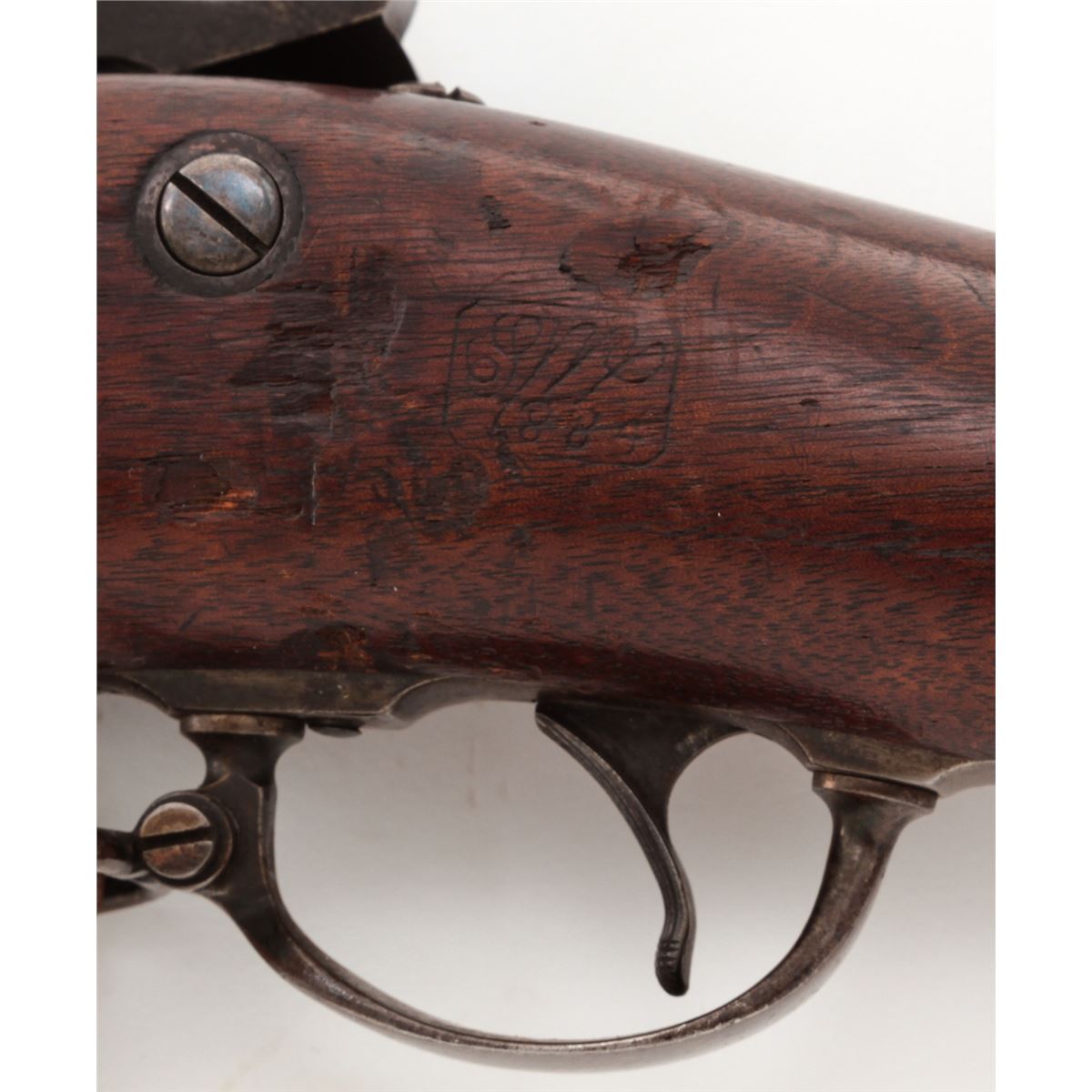 U.S. Model 1879 Trapdoor Single Shot Rifle, by Springfield, #281207, .45-70 cal., 32'' barrel, blue and case hardened finish, cartouched walnut stock, with bayonet and leather sling. Condition is very good retaining approx. 85% finish. Stock with moderate scuffs, relatively clear cartouche. Action is good, bore is fine. Est.: $1,000-$1,500. (Antique)