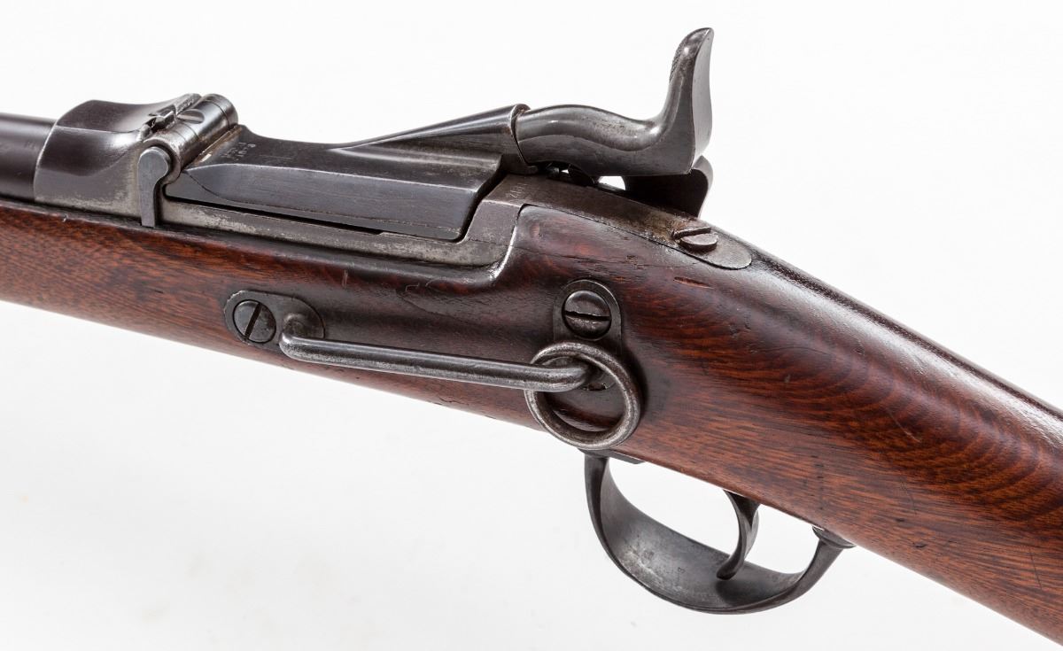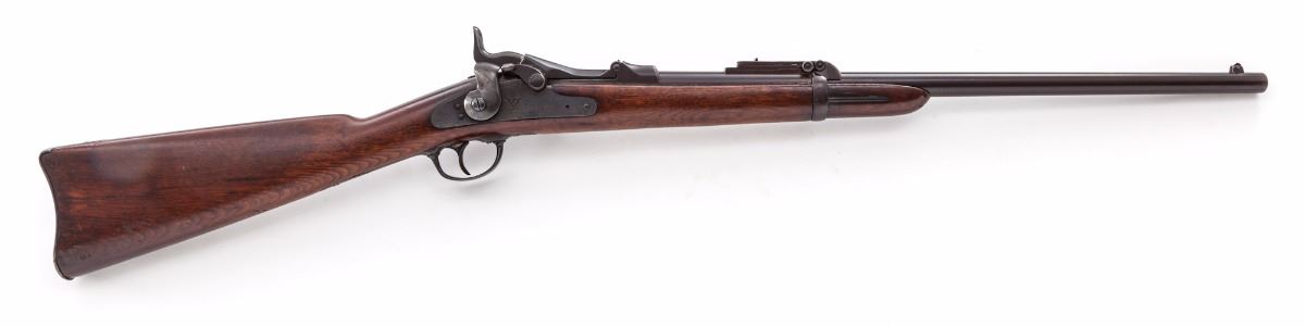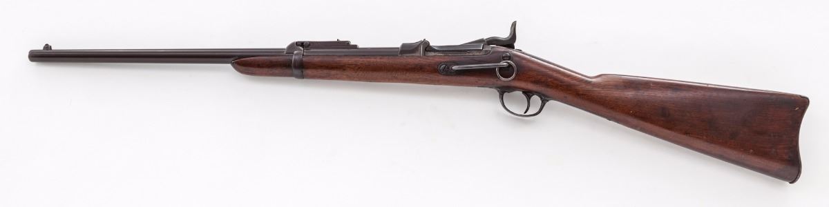 U.S. Model 1890 Trapdoor Carbine, by Springfield, #210157, .45-70 cal., 22'' barrel, blue finish, walnut stock with ''H'' mark beneath triggerguard tang, with saddle bar; front band with sight protecting scabbard guide. These Carbines were updated to 1890 specifications and used in limited numbers during the Spanish-American War. Condition is very good, as arsenal modified, retaining approx. 60% toning blue finish. Breechblock has been colored dark. Stock with minor fissures near saddlering bar and repair to left side of upper tang. Action is good, bore is very good. Est.: $800-$1,200. (Antique)
