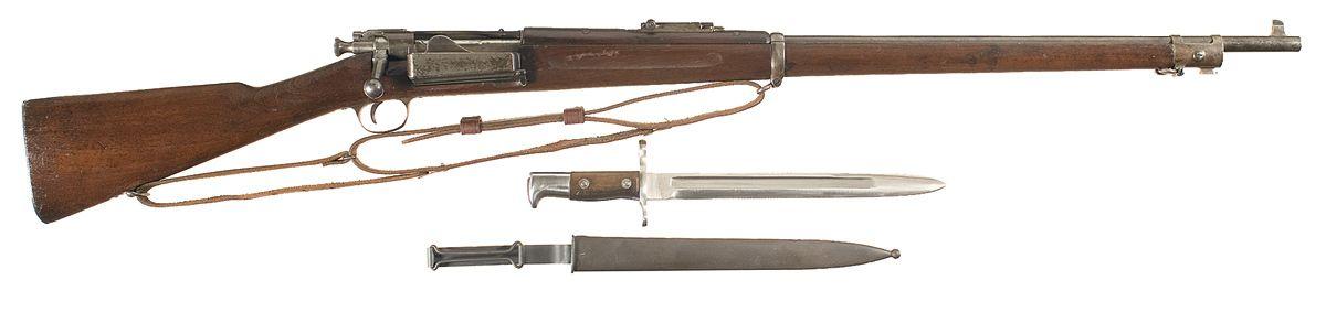 Blade and ladder sights, with standard receiver markings, 1903 stock cartouche, script "P", smooth stock, flat butt, brown leather sling and a 1903 dated U.S. bayonet, 11 3/4" blade and metal sheath.