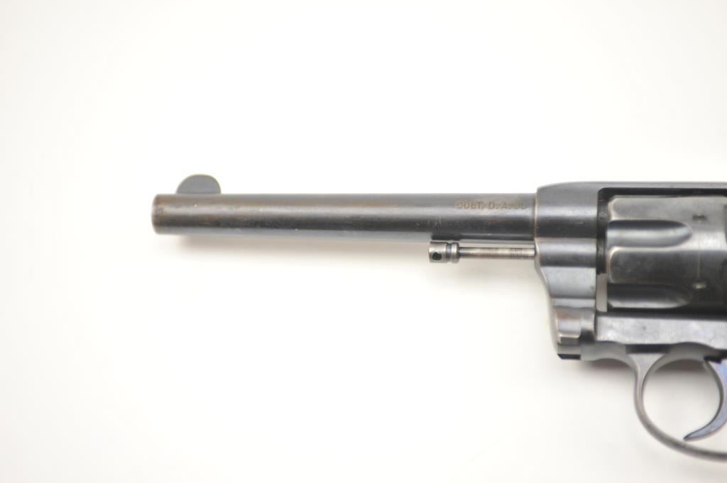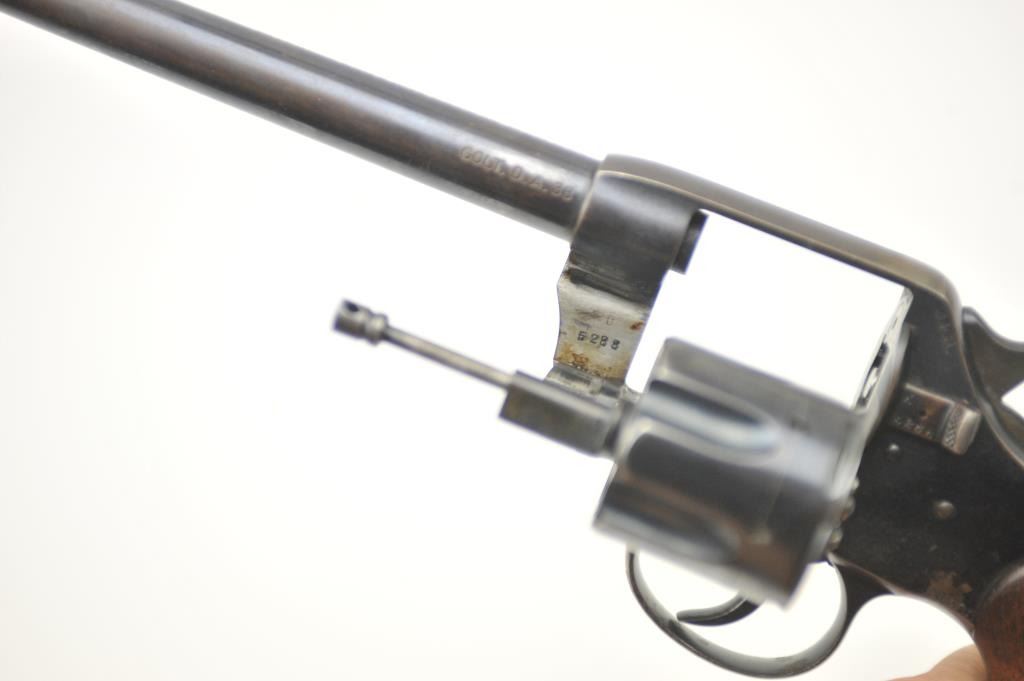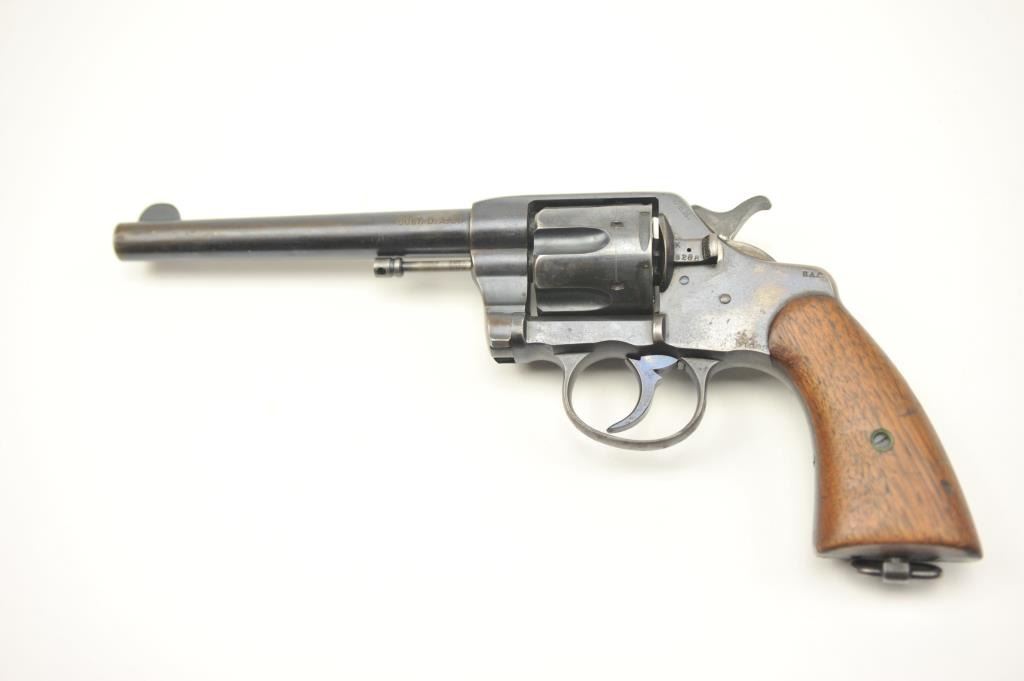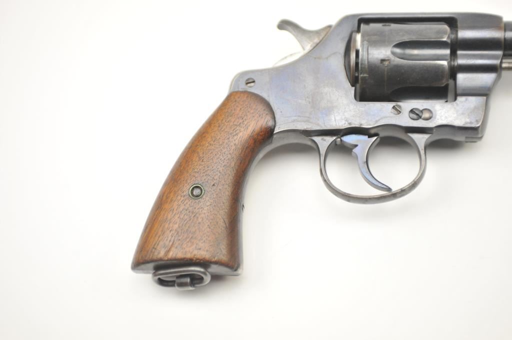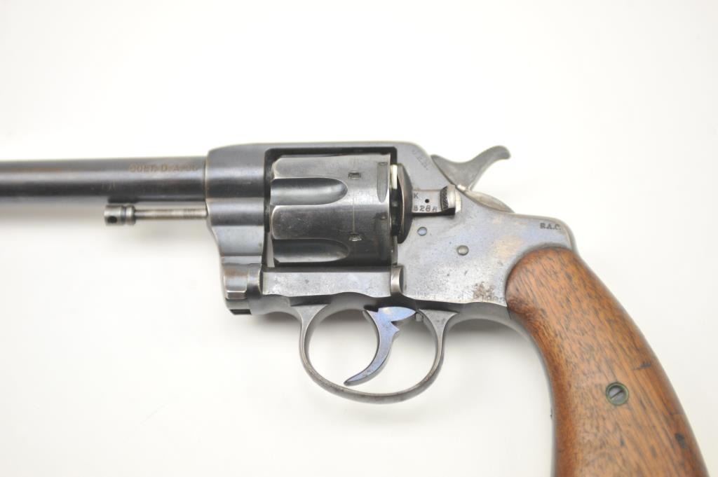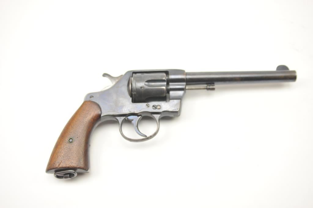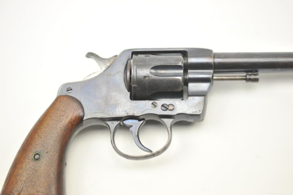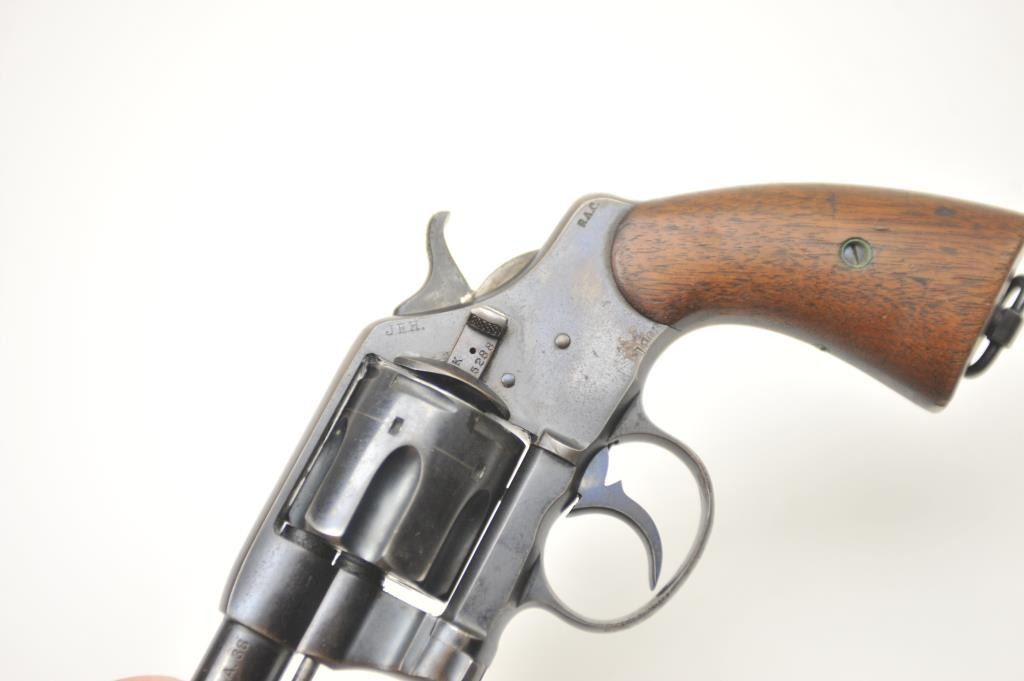 U.S. Model 1903 .38 Colt Caliber military issue revolver in very good condition, S/N 205288. 50%-70% evenly toning original blue finish that is aging nicely with some minor rust and erosion and some just startingpinprick pitting. The grips are also very good with minor scrapes, dinks and mars and 2 R.A.C. inspections. 1 on bottom of each grip. 1901 on frame, J.F.H and R.A.C. stamps also on the frame is “K” sub inspection oncylinder release. Sharp address and markings. Good tight action and shiny near excellent bore. A 7.5-8 on a 1-10 scale with no issues. (C&R/PPT) Est.: $400-$800
