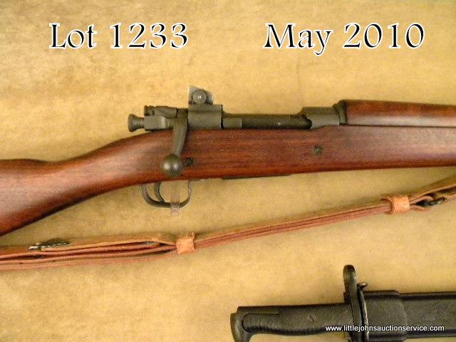 U.S. Model 1903 A3 issue service rifle by Smith-Corona in fine to excellent condition, #4839518. Barrel “sc” marked with 10-42 date; the metal surfaces show 95%+ arsenal finish, just slight lightening at muzzle and edges, the leftside of stock shows “FJA” cartouche over trigger, faint ordinance wheel, “P” proof behind trigger guard and four small inspections in front of trigger guard in stock; the stock is very good + to near fine; a leather sling; wartime bayonetmarked “UC” with scabbard is included; the interior is fine to excellent. The rifle shows very slight use and handling. Est.: $500-$1,000.