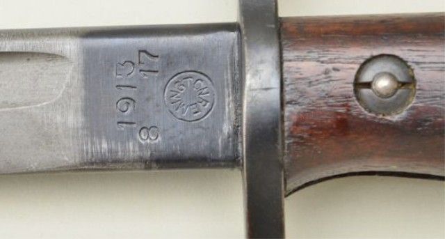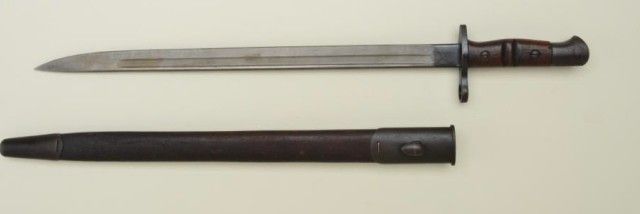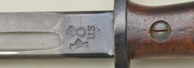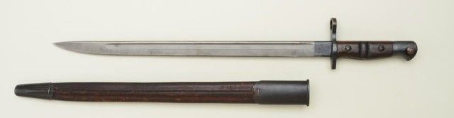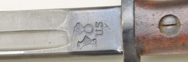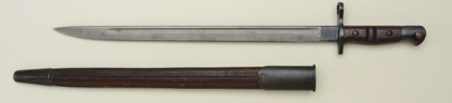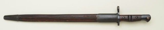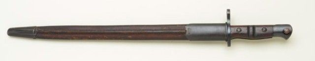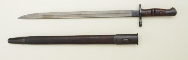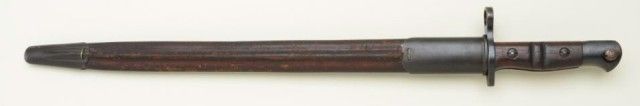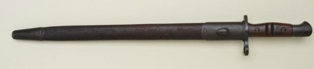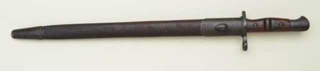 U.S. Model 1917 bayonet by Remington with leather sheath and wood grip; blade is in overall fine condition with US, flaming bomb and eagle head on one side of hilt and 1913, 8 17, and the circular Remington insignia on the other side of hilt; sheath is overall very good with good stitching and very good metal throat and tip; a harder-to-find accessory in this condition. Est.: $75-$150.