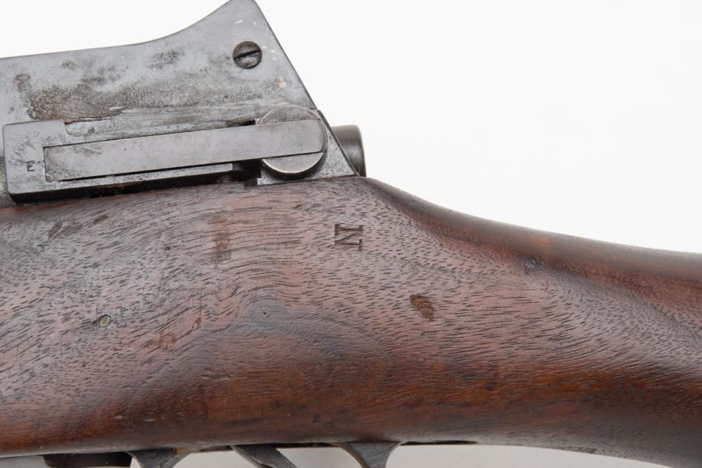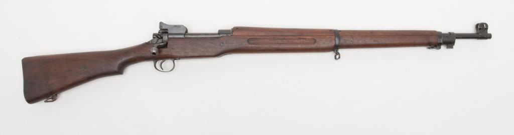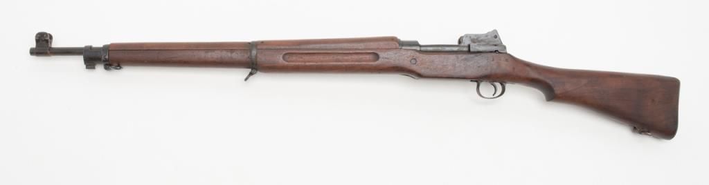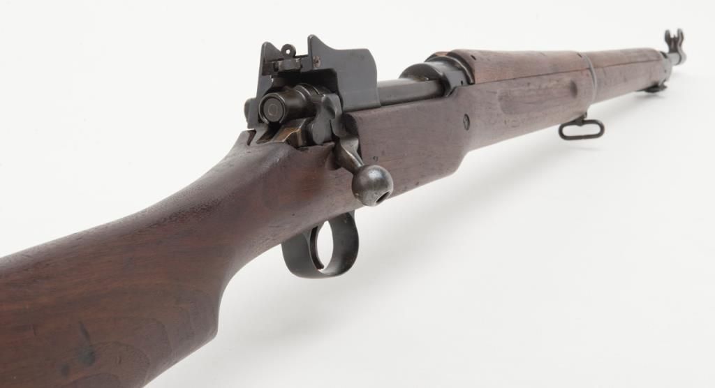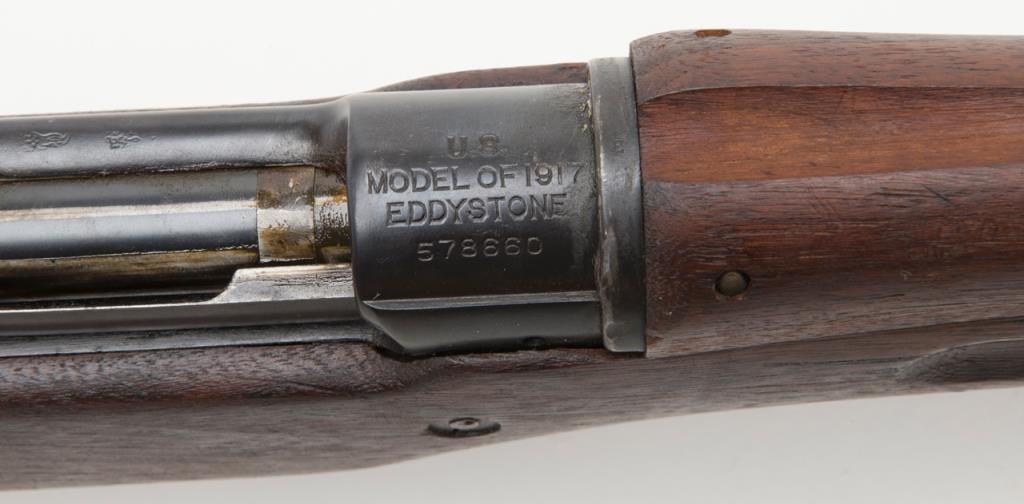 U.S. Model 1917 bolt action military issue rifle by Eddystone Arsenal in near fine condition packed in cosmoline or military grease, serial number 578660. The barrel shows “Eddystone Arsenal” marking along with firebomb and 4 – 18 date. Themetal surfaces retain most of the original blue under a coating of thick grease. The stock is very good plus to near fine with two sharp cartouches showing Eagle heads just ahead of trigger guard and behind trigger guard with numbers 359 and 301and a small “B” or “R”. There is also a “N” stamp just below the action and top of the wood. The interior shows little to no use and is packed with grease as is the bore. An exceptional 1917 that looks like it will clean to fine or excellent butat the least very good plus. Est.: $500-$1,000