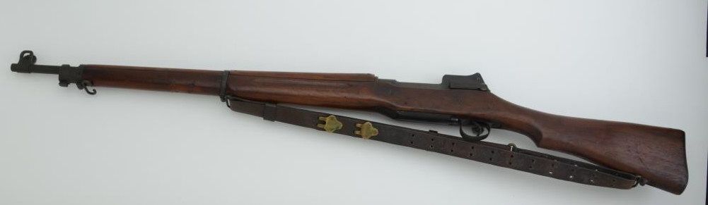 U.S. Model 1917 bolt action rifle by Remington, .30-06 cal., 26-1/2” R barrel dated 9-18, parkerized finish, wood stock, #523545. This gun is in overall good condition as re-finished showing most of that color; good bore, action, markings and stock with leather sling; “4B” and eagle head proof behind trigger guard in stock. From an old estate. Est.: $300-$600.