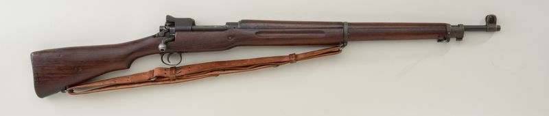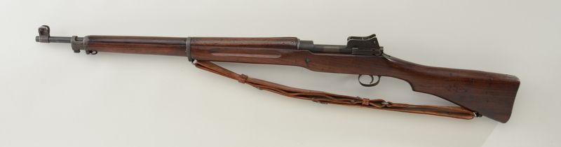 U.S. Model 1917 bolt-action rifle by Winchester, .30 cal., 26-1/2” barrel dated 3-18 with W and flaming bomb markings; military finish, wood stock, leather sling, #202245. This gun is in overall goodcondition showing the majority of its military finish, good bore, action, markings and wood with scattered old mars and scratches from carry and storage; eagle head inspection cartouche behind trigger guard.Est.: $400-$800.