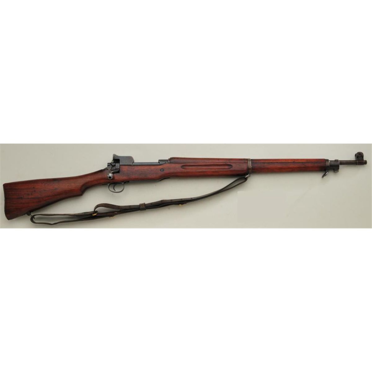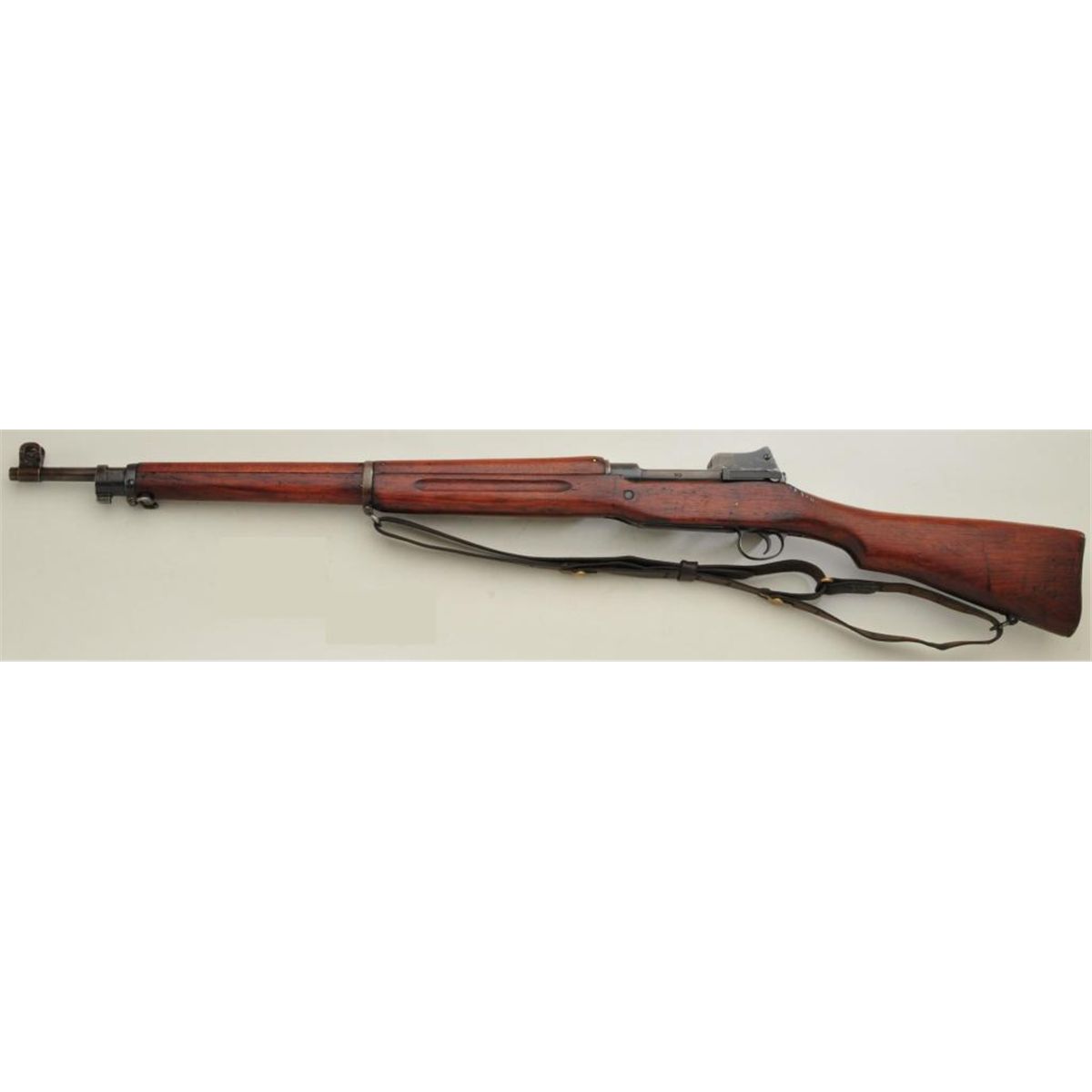 U.S. Model 1917 military bolt action rifle by Eddystone, .30 cal., 26” Eddystone barrel with flaming bomb and dated 10-17, blue finish, leather sling, wood stock, #49767. This gun is in overall very good + conditionshowing a light brown patina on barrel with areas of blue finish on the receiver, very good to fine bore, crisp action, sharp markings, very good wood stock with “GU” inspection stamp behind trigger guard andscattered old mars and scratches from carry and storage; fair + leather sling. From the Dr. Sterling Fenn collection. Est.: $400-$800.