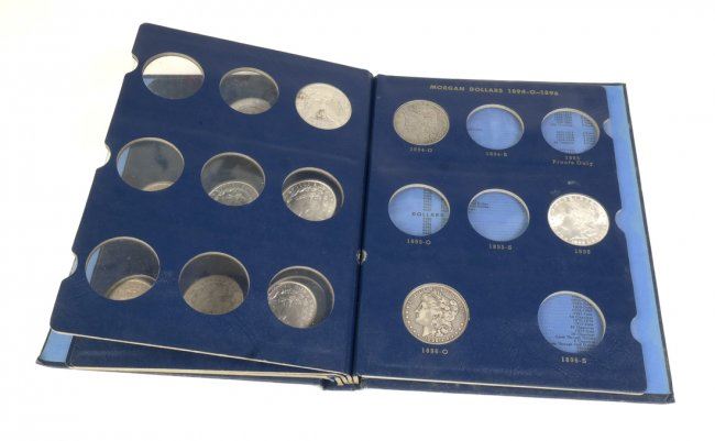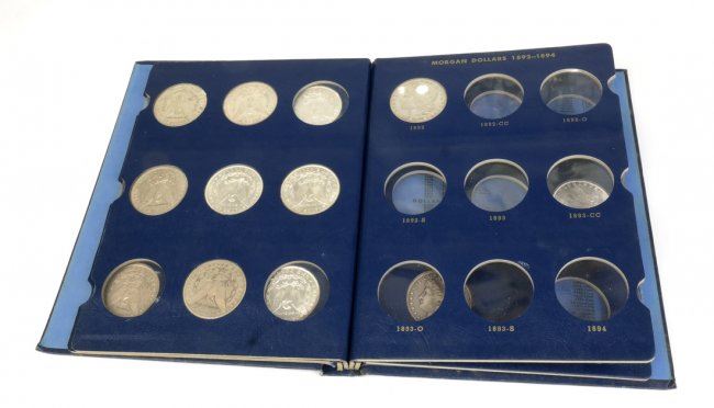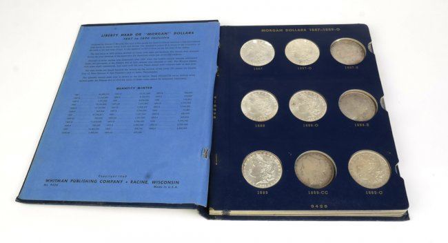 A further selection of sixteen mixed uncirculated and circulated Morgan dollars in 1887-1896 Whitman album. Not complete. Includes 1887, 1887O, 1887S, 1888, 1888O, 1889, 1889O, 1890, 1890CC, 1890O, 1890S, 1891, 1891O, 1892, 1894O, 1896, and 1896O. Total of sixteen coins in one album. About half are uncirculated, some have been cleaned.