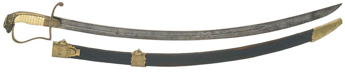 29 1/2" curved single fuller blade with engraving and gold fill, cast brass hilt, unmarked brass guard, ribbed bone grip and eagle head pommel. With brass fitted leather scabbard. Fair, with pitting, soldering of the brass, chipped grip and cracking leather.