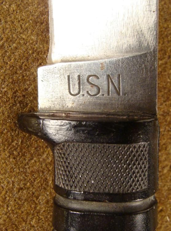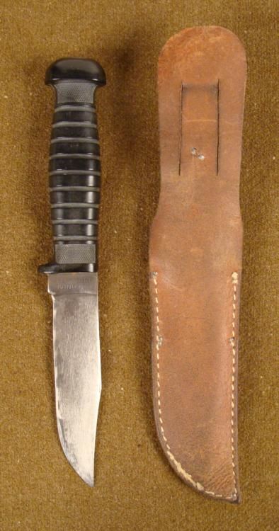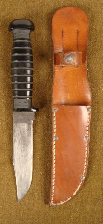 U.S. NAVY COMBAT FIGHTING KNIFE BY COLONIAL WITH LEATHER SHEATH * * U.S. NAVY FIGHTING COMBAT KNIFE-WIDE, CLIP-POINT 5 1/8" BLADE--RICASSO MARKED "USN"--REVERSE "COLONIAL- PROV. RI"--RIBBED GRIP-BROWN LEATHER SHEATH WITH RETAINER STRAP AND SNAP CLOSURE--STITCHING IS SOUND *