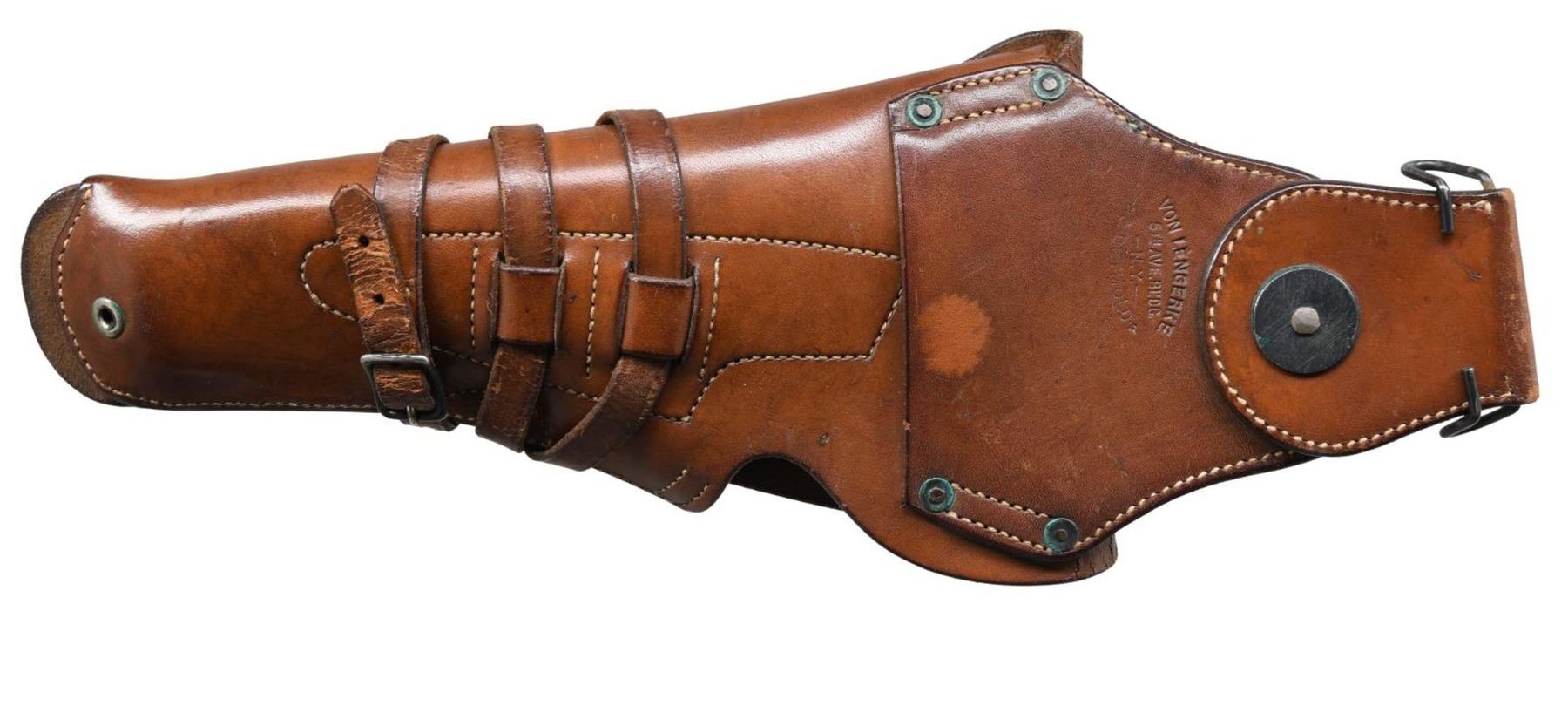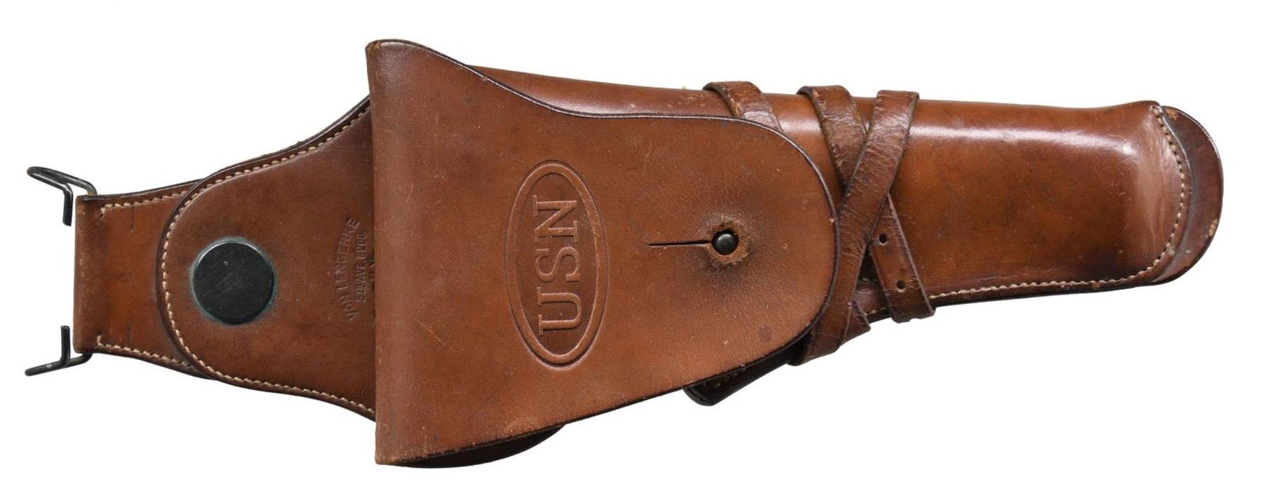 1911 COLT PISTOL. This holster is referenced on page 544 of the book, U.S. MILITARY HOLSTERS AND RELATED ACCOUTREMENTS by Edward Scott Meadows. This high quality private purchase russet leather holster is marked w/ "USN" in oval on front of flap and marked on front and rear of the hanger the supplier's name "VON LENGERKE & DETMOLD / 5TH AVE. B'LDG / N.Y.". The hanger extension allows the holster to swivel 360 degrees. Extension is equipped w/ Model 1910 style belt hook. Leather leg strap is present. Holster is stitched at the bottom w/ a welt and has grommetted drain hole on the inside. Holster flap is secured by brass finial. CONDITION: holster has seen a degree of careful use w/ light wear & staining plus slight flexing at top of flap. Leg strap has notable flexing & wear. Stitching is tight plus markings are crisp & legible. PROVENANCE: The Collection of Edward Scott Meadows. (02-22132/RW). $1,000-2,000.