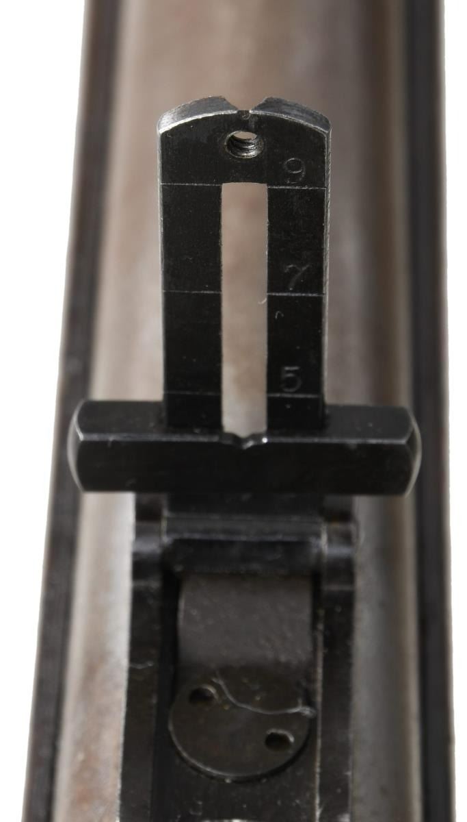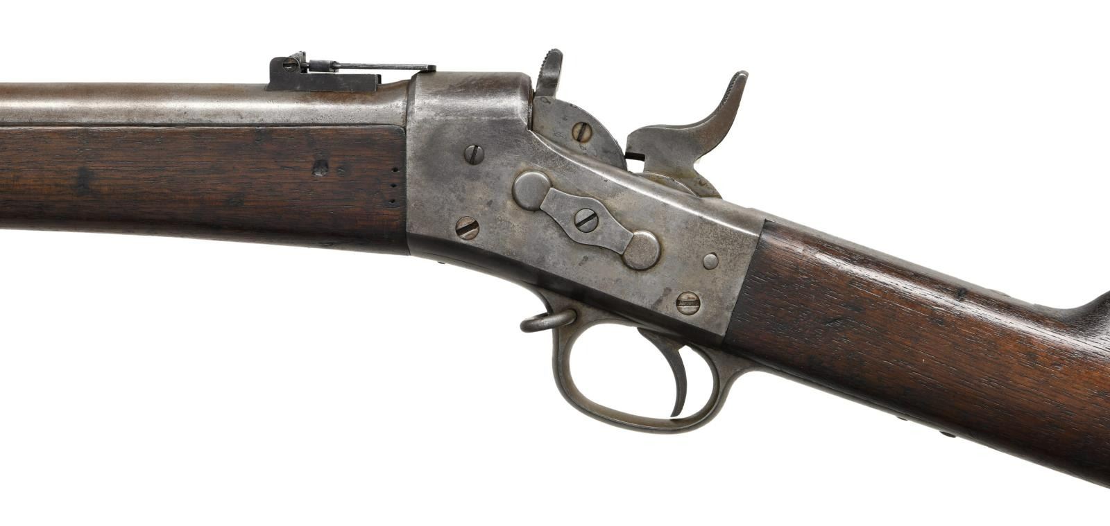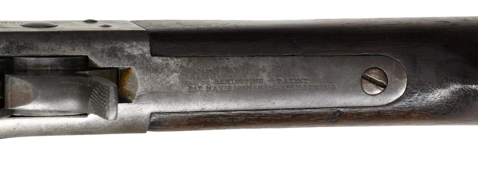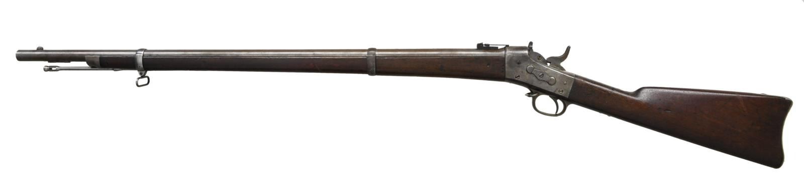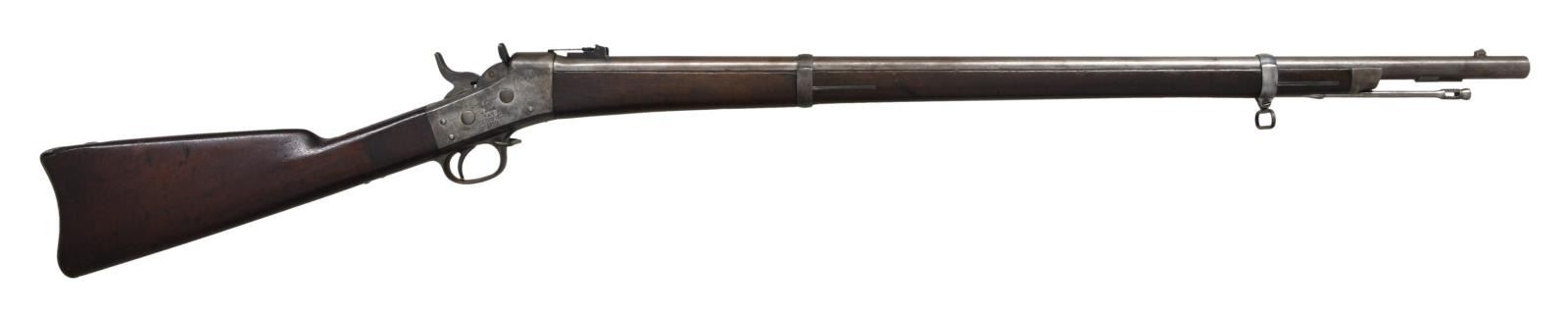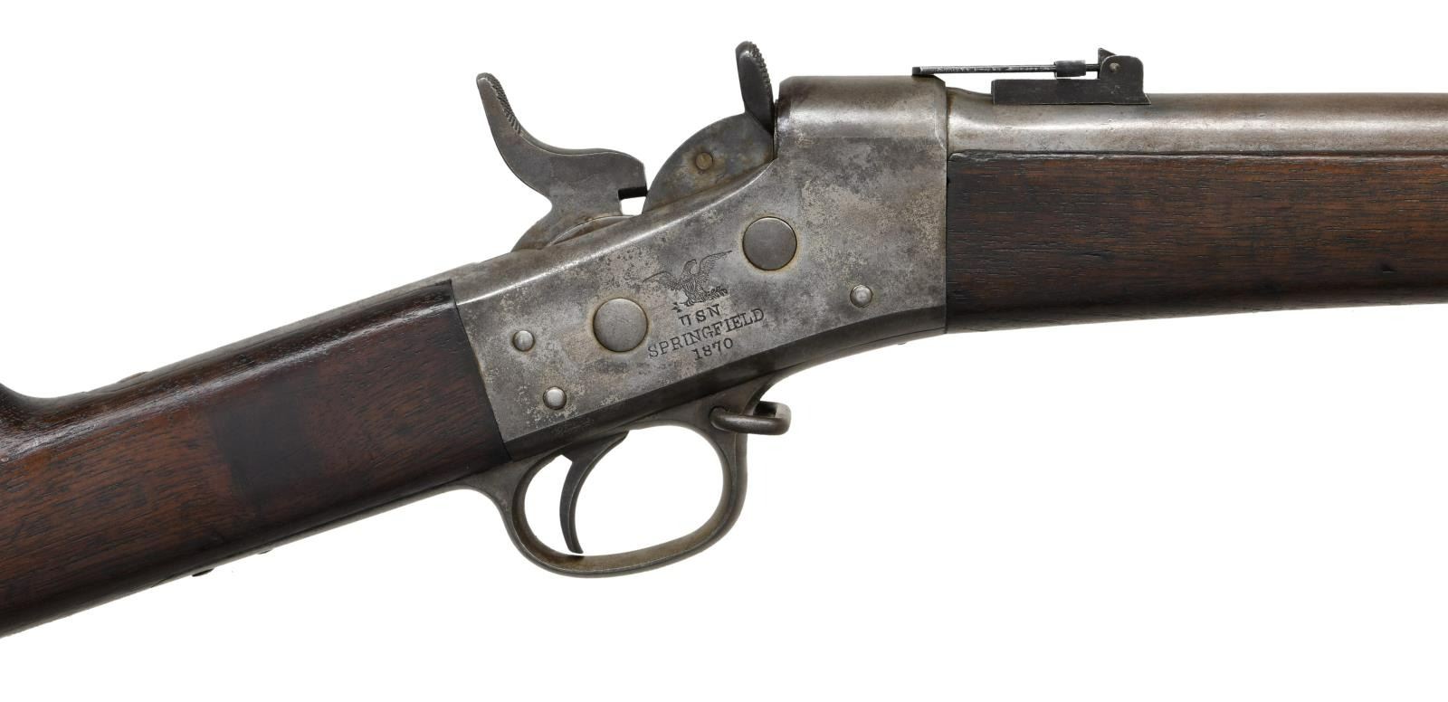 SINGLE SHOT RIFLE. Cal. 50-70. S# NSN. Bbl. 32 5/8" w/ ladder rear sight graduated to 1,000 yds. Stud type front sight. These rifles were mfg. by Springfield Armory for the U.S. Navy. The action is marked on the right side w/ the eagle "USN SPRINGFIELD 1870". Information on these interesting rifles in the book Remington Rolling Block Military Rifles of the World by Layman states that following a dubious transaction w/ purchasing agents for the French Government these rifles were condemned as the placement of the rear sight on the bbl. was only 1/2" in front of the receiver instead of the required 3 1/8". Most rifles went to France but some had already entered the U.S. Navy & were on board ship at distant parts of the world. There are two versions of this rifle which are the early "rejected" models & the later "accepted" models w/ correct sight placement. Sliding extractor. Receiver tang has Remington patent markings. Swivels mounted in trigger guard & upper band. Ramrod is present. Unmarked walnut stock set & forend retained by 2 solid bands secured w/ band springs. Buttplate is marked "US" at tang. CONDITION: stock set has nice appearing original finish w/ light wear & scattered handling marks throughout. Bright metal turning gray & patina. Upper band has been polished bright. Ramrod has cleaned appearance. Receiver retains traces of case colors. Very good shiny bore. Good sharp lands. (01-23454/RW). ANTIQUE. $500-800.