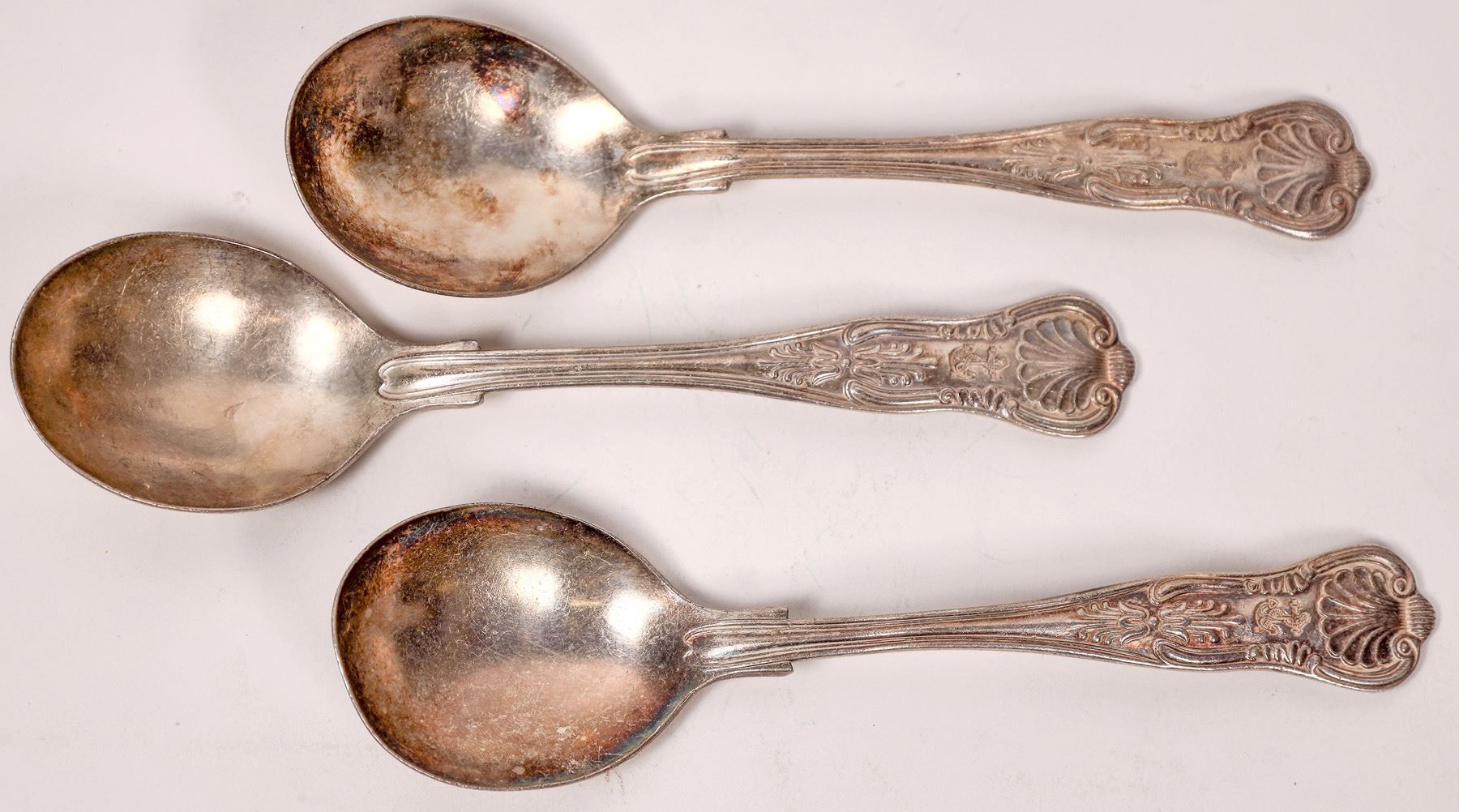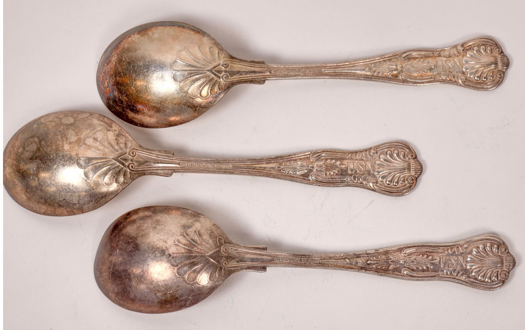 Three serving spoon made by International Silver Company. Anchor motif on the front, "U.S. N." on the back. Each spoon 7 inches long. Possibly from the Spanish American War era. City: State: Date: