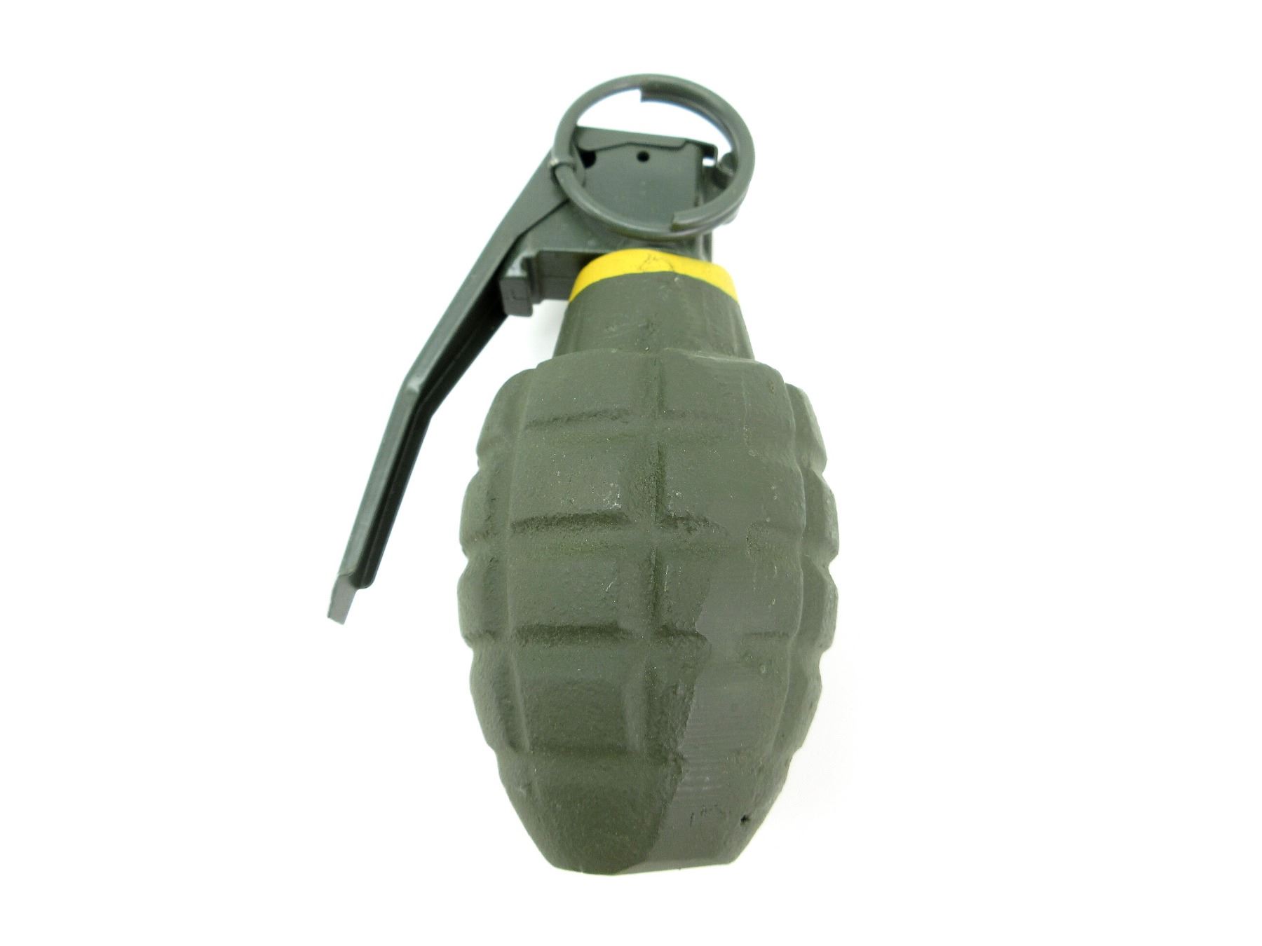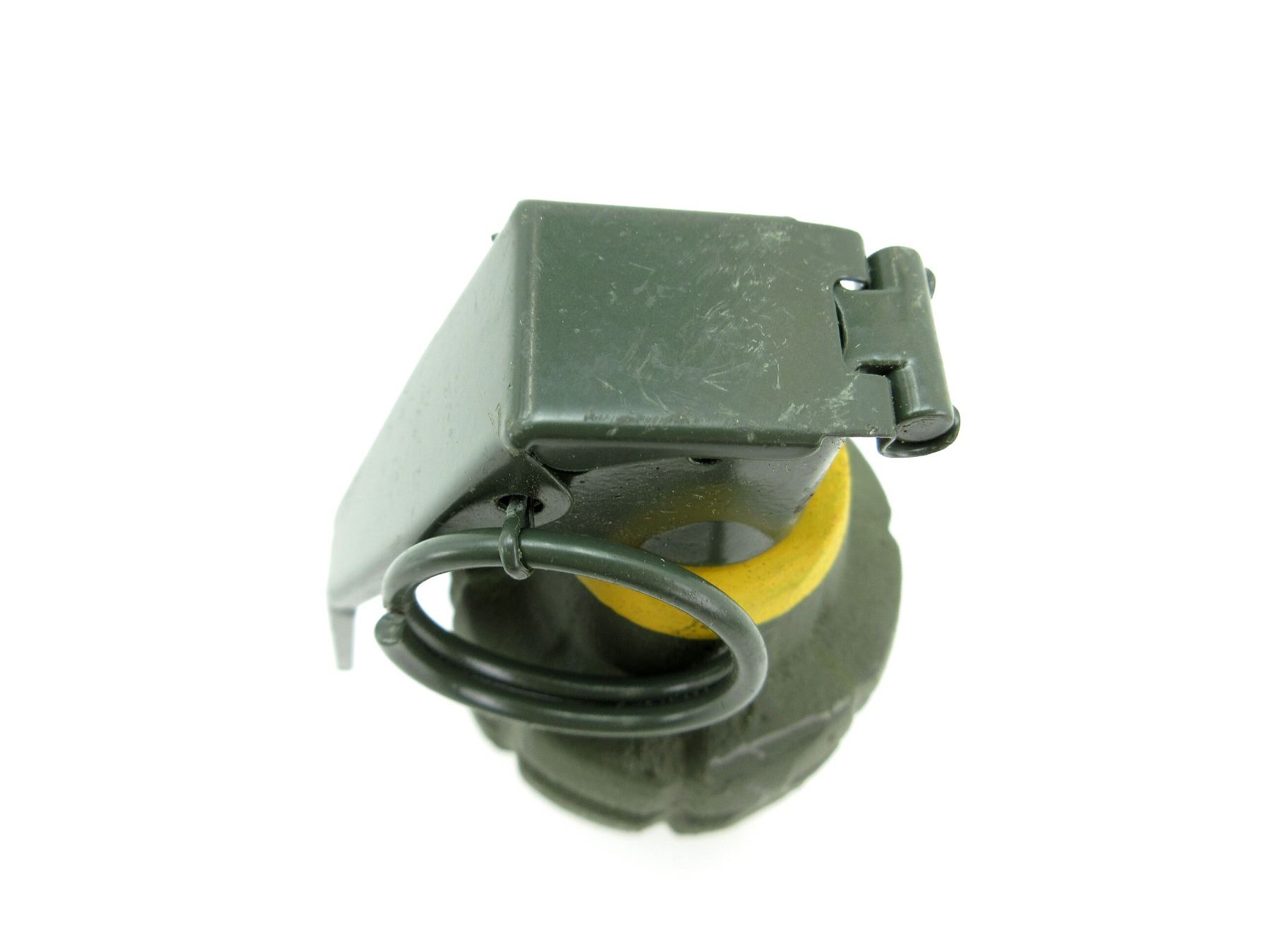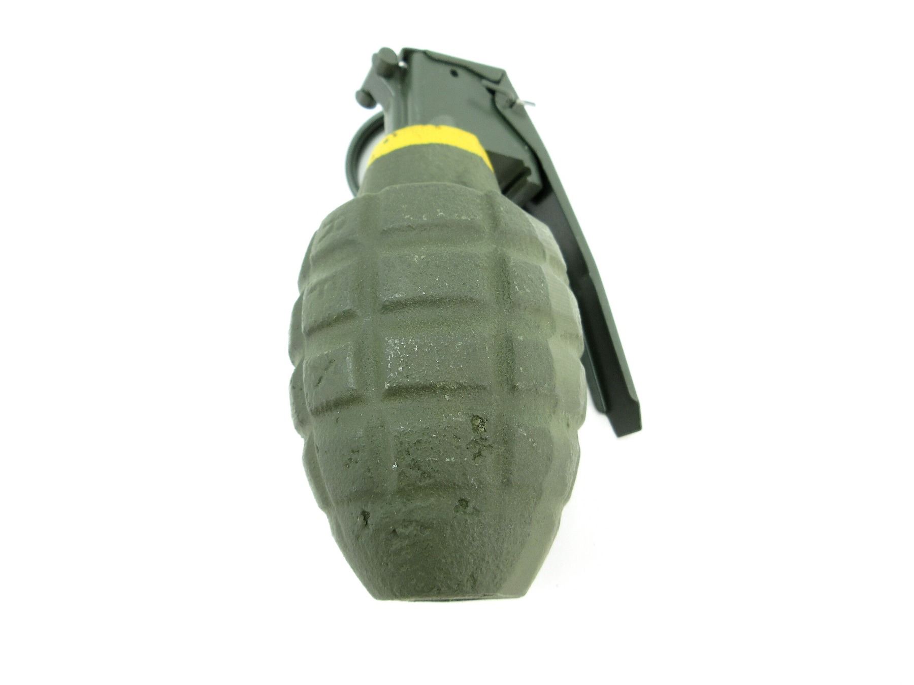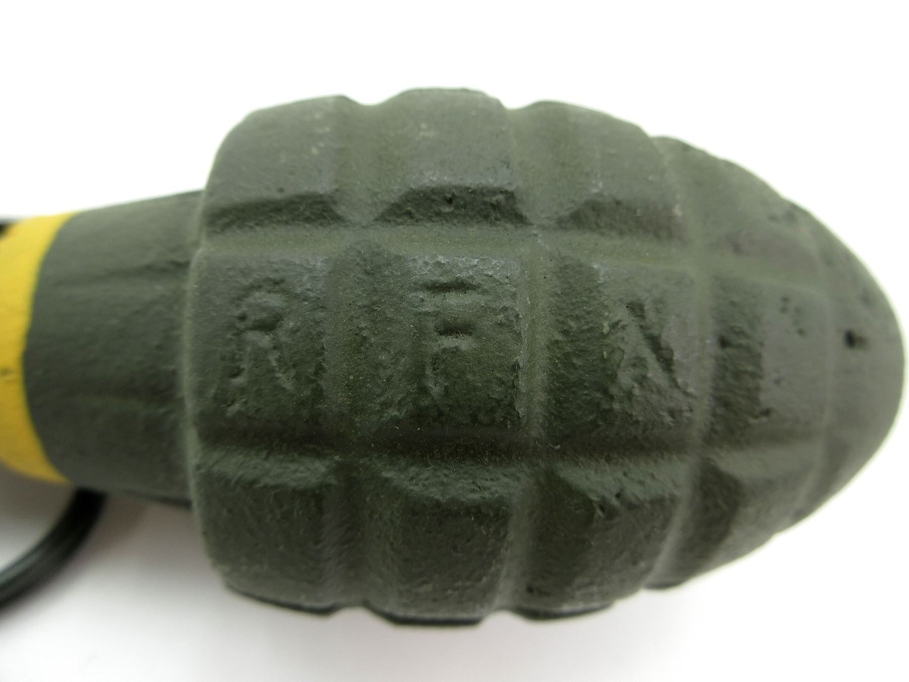 (1) CAST STEEL GRENADE WITH DUMMY FUZE, GRENADE MARKED: "RFX", FUZE HAS NO VISIBLE MARKINGS, APPROX. 2 1/8" DIA. & OAL APPROX. 4.5". SEE PHOTOS.