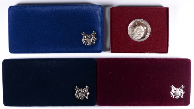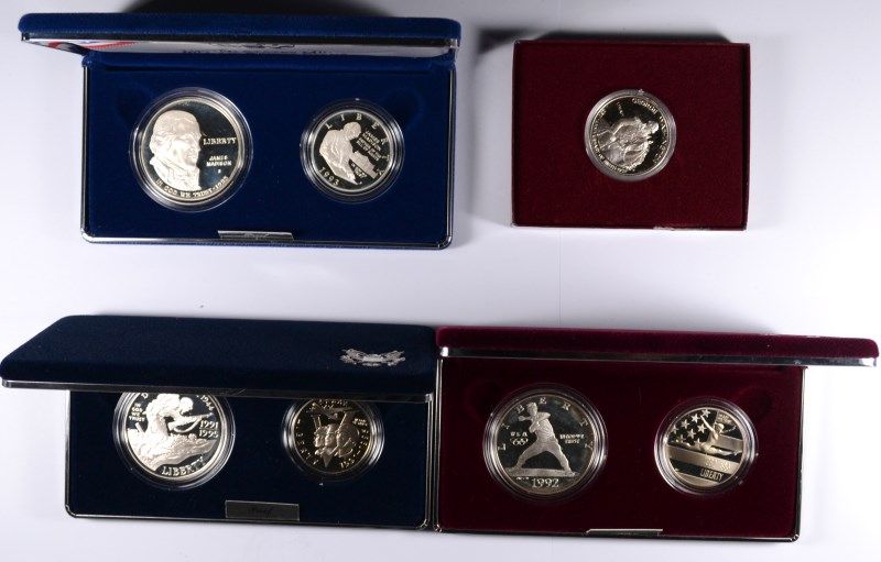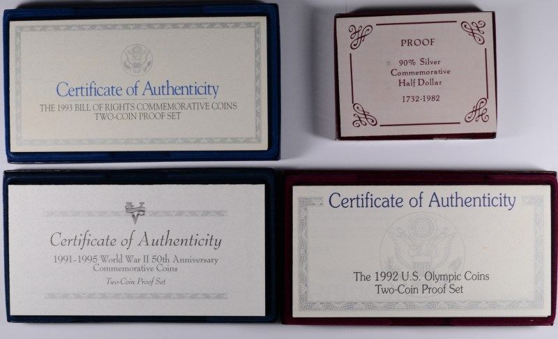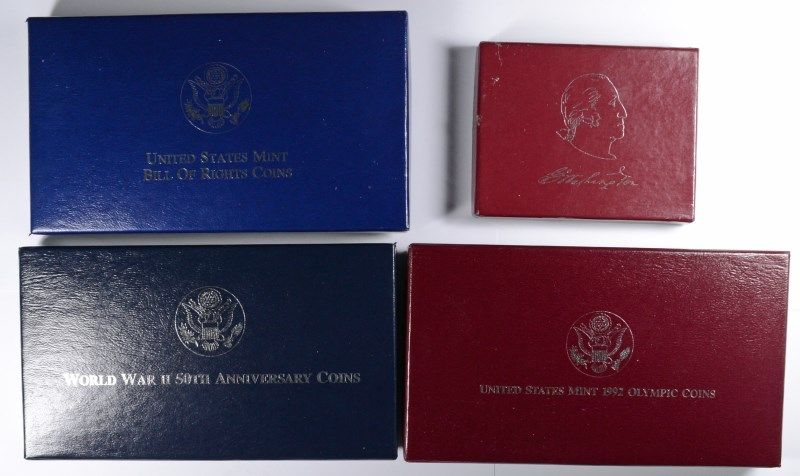 1982 WASHINGTON HALF DOLLAR, 1992 OLYMPIC 2-COIN SET, 1993 WWII 2-COIN SET, 1993 BILL OF RIGHTS 2-COIN SET, ORIGINAL PACKAGING ESTIMATE, $155.00 TO $175.00 Bid with confidence at Silvertowne Auctions. One of internet’s leading Auction Houses