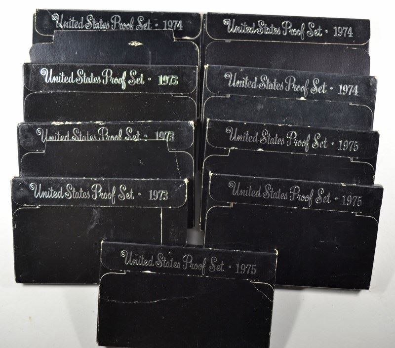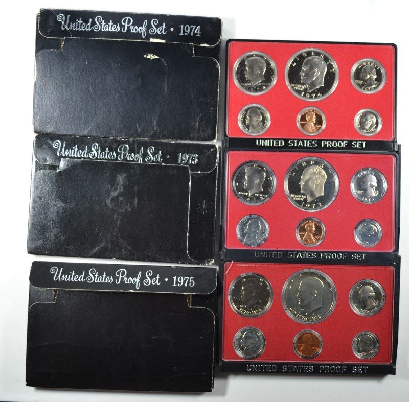 U.S. PROOF SETS IN GOVERNMENT BOXES: ( 3 ) 1973, ( 3 ) 1974 AND ( 3 ) 1975