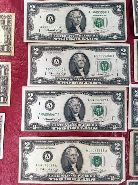 8 $1 Silver Certificates, 13 $2 Bills including Red seal, 8 $5 Blue and Red Seal Certificates, 2 $20 one is Federal Reserve Bank of Boston, one 1928 B. Total face $114.00