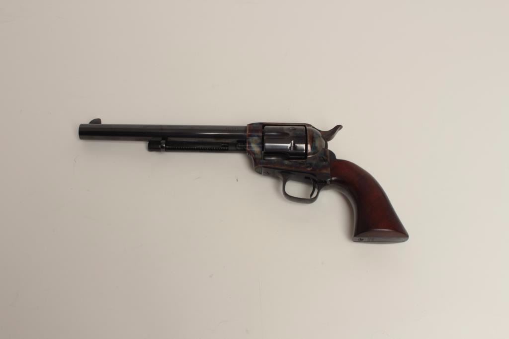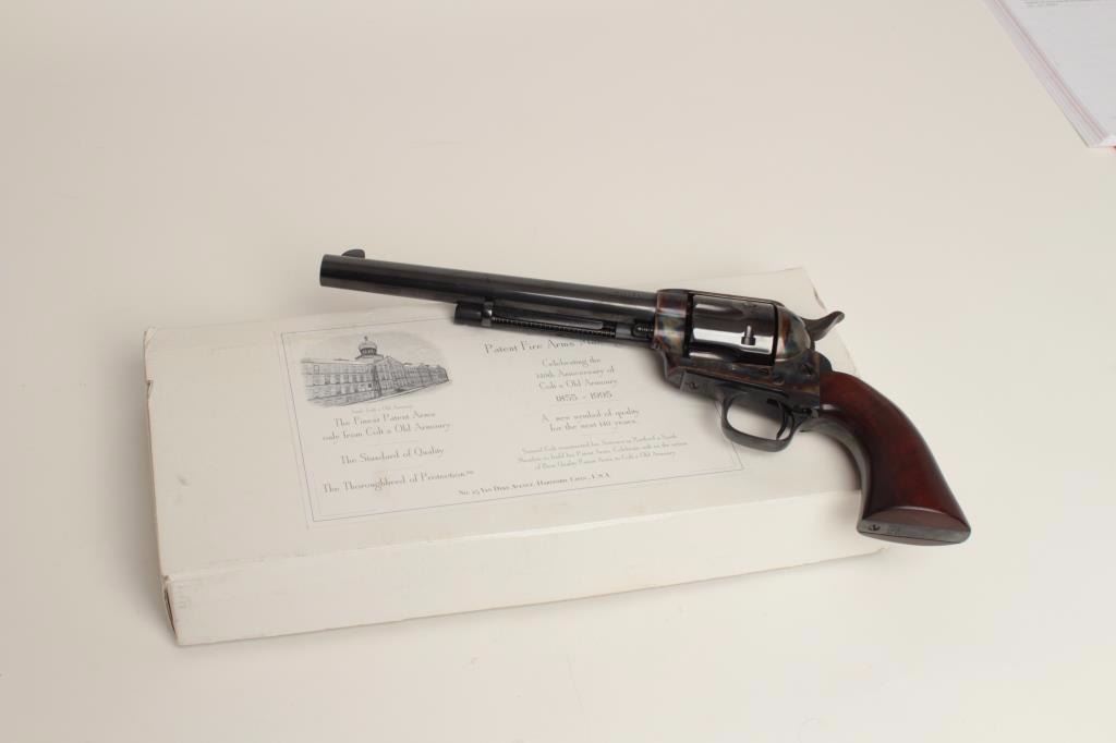 a Colt SAA revolver, .45 caliber, 7.5” barrel, blued and case hardened finish, wood grips, S/N P010358, in like new condition with factory cardboard box and instructions manual; label on lid of box includes “Celebrating the 140th Anniversary of Colt’s Old Armoury, 1855-1995”. (Consecutive number to next lot). (Modern/PPT). Est.: $400-$800.