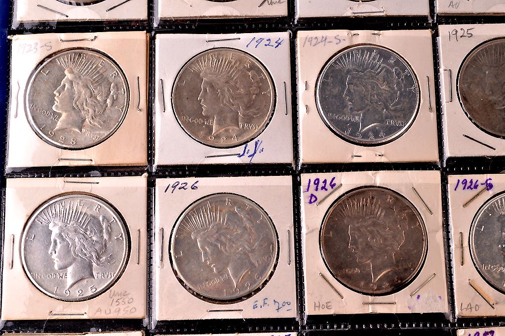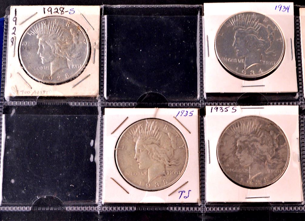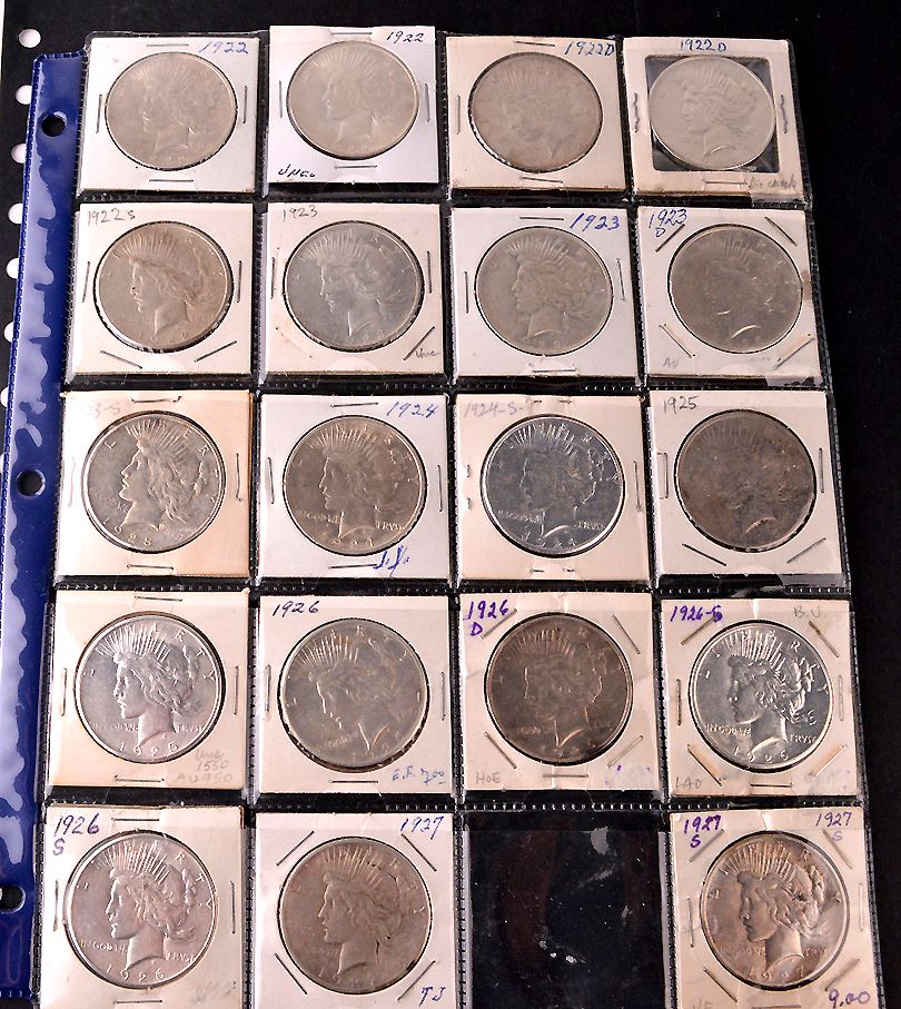 United States, Peace Dollars, 1922 to 1935: 1922, (2); 1922-D, (2); 1922-S; 1923, (2); 1923-D; 1923-S; 1924; 1924-S; 1925; 1925-S; 1926; 1926-D; 1926-S, (2); 1927; 1927-S; 1928-S; 1934; 1934-D; 1935; 1935-S; grades range from VF to Unc, most EF to AU. Couple are cleaned, but all are generally decent. Total of 24 coins
