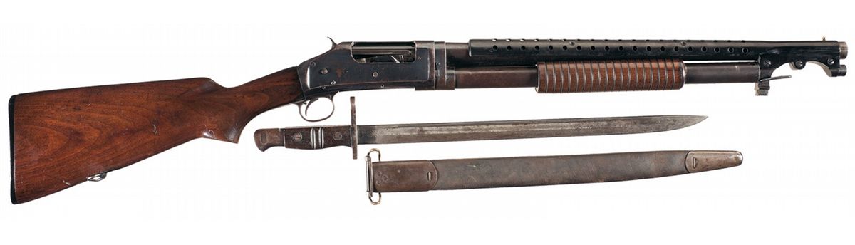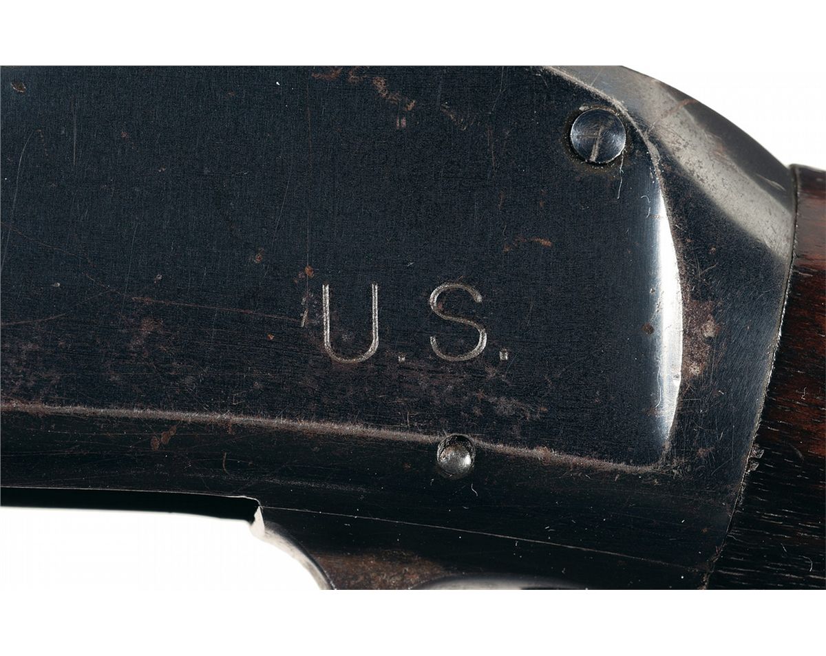 Manufactured in 1948. The rear lower left side of the receiver is marked with "U.S." The left side of the barrel at the breech is marked "2 3/4 CHAM/CYL." with the top marked with a flaming ordnance bomb and a Winchester factory proof. A factory proof is repeated on top of the receiver at the breech. The shotgun has a reproduction 4-hole handguard. The stock is stamped with a boxed "WB" over a cross cannon ordnance cartouche on the left side. Length of pull is 14 inches. Comes with a Remington bayonet stamped "1913/8 17" and double stamped "US" near a struck marking. The bayonet has a scabbard.