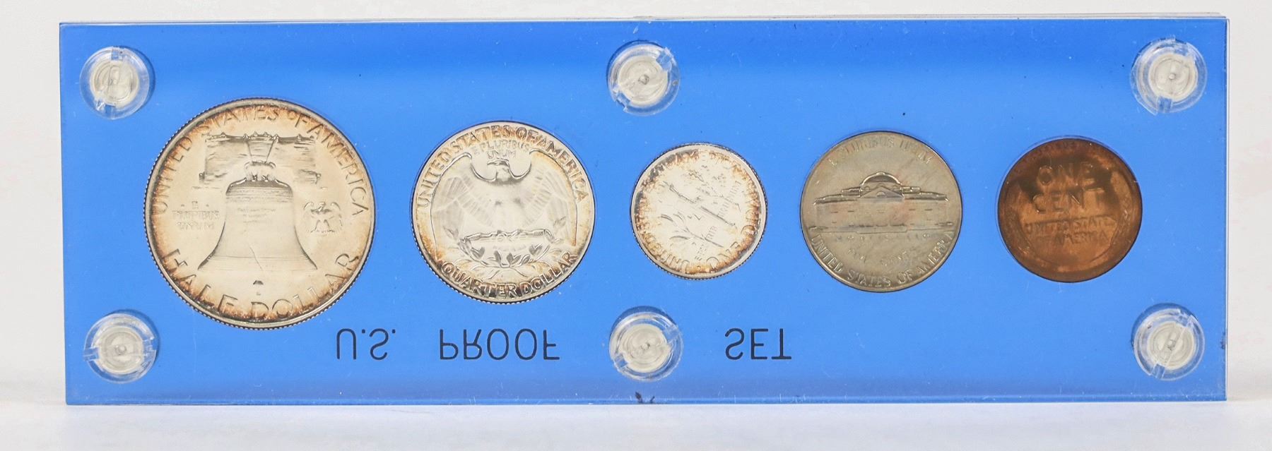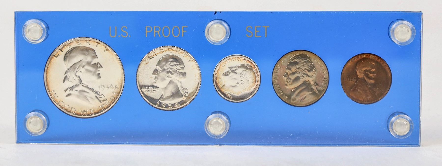 Choice 1954 United States proof set. Five coins in Capital Plastics holder with blue background and gold lettering.