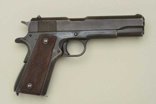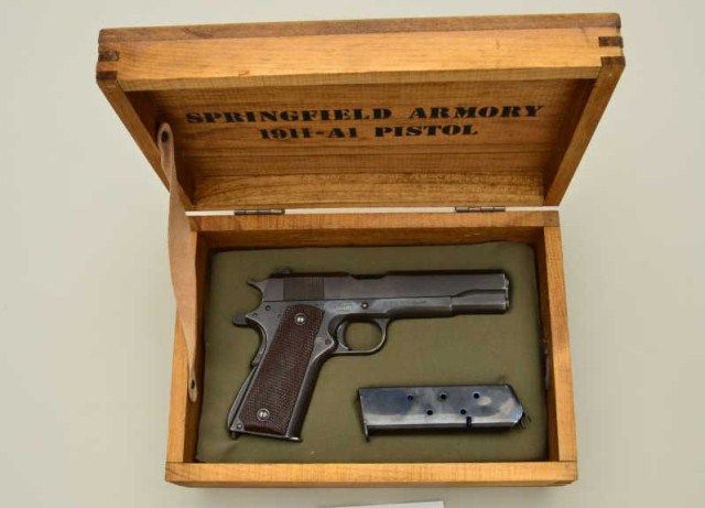 U.S. Property Model 1911-A1 semi-auto pistol by Ithaca, .45 cal., 5” barrel, re-parkerized finish, checkered maroon plastic grips, #2112462 with modern Springfield Armory wood presentation box , extra magazine and leather U.S. flap holster by Boyt dated 1942. This gun is in overall very good to near fine condition showing the majority of its military finish, very good bore, crisp action, very good markings including “FJA”inspection on left side of frame at trigger and partial crossed cannons on right side of frame above grip safety; fine grips; display box is overall fine; extra magazine is of later vintage. Est.: $900-$1,800.