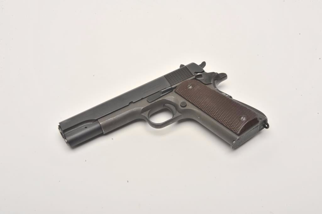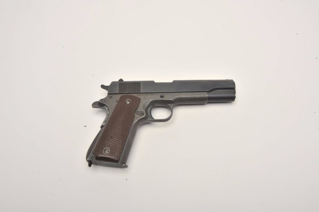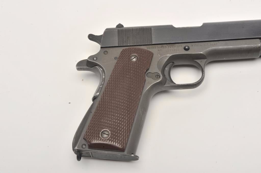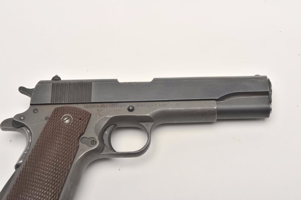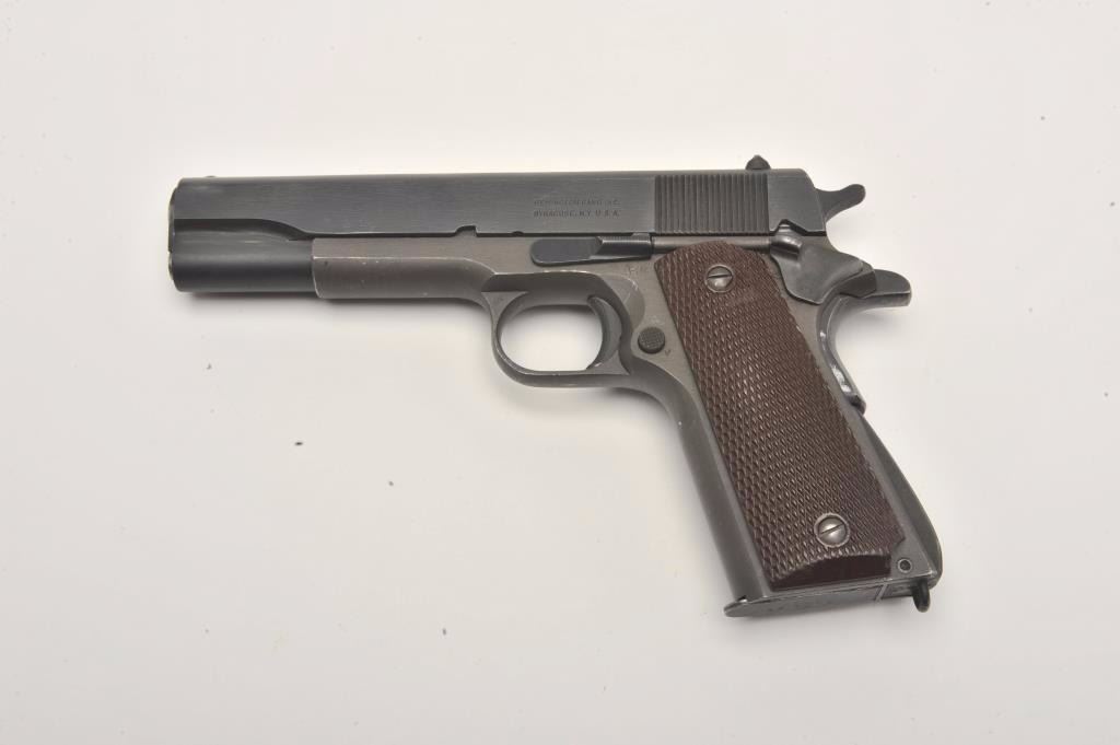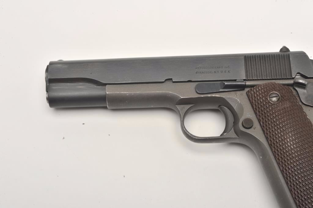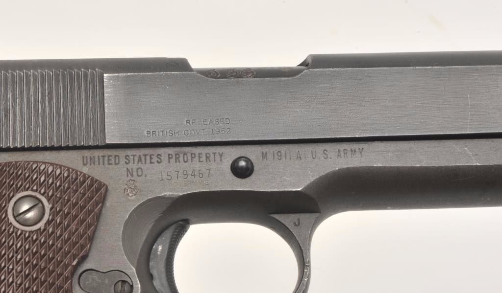 U.S. Property Remington Rand Model 1911-A1 semi-automatic pistol, “Battle of Britain” shipped to England during WW II and marked on right side of slide “RELEASED BRITISH GOVT 1952” and “NOT ENGLISH MAKE”; .45 caliber, 5” barrel, parkerized finish, S/N 1579467, in overall very good to fine condition showing the majority of its military finish, fine bore, crisp action and markings, fine grips. (C&R/No PPT). Est.:$1,000-$2,000.