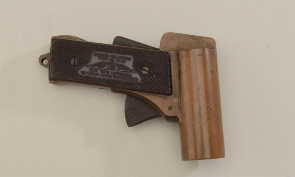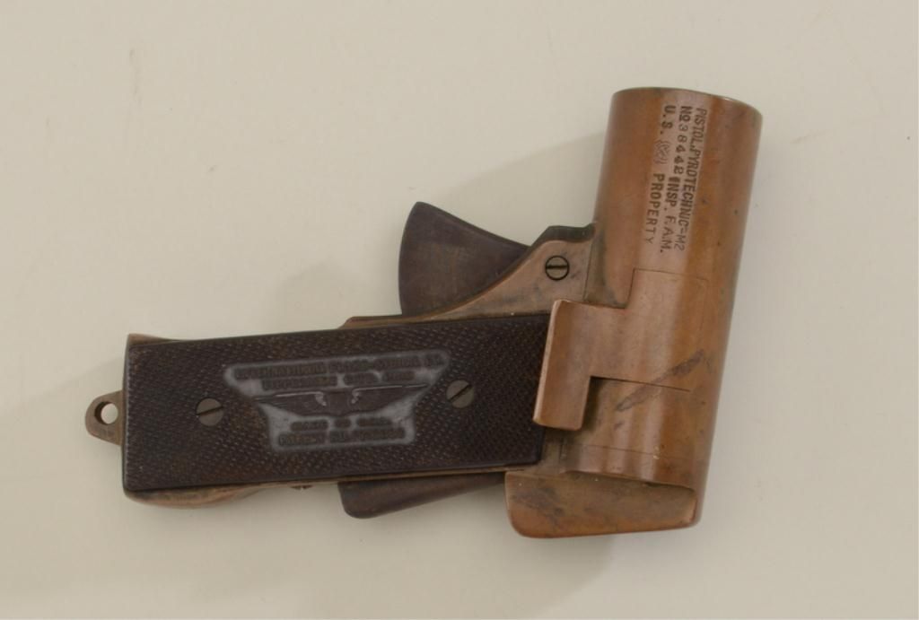 U.S. Property marked 37mm brass flare pistol with checkered black hard rubber grips, in overall very good condition with taffy colored patina. Est.: $150-$300.