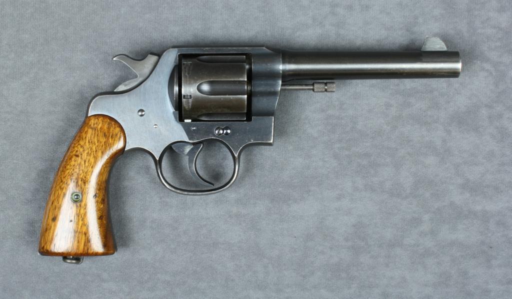 U.S. Property marked Colt Model 1917 DA  revolver, .45 cal., 5-1/2” barrel, military  blue finish, wood grips, lanyard ring,  #148030. This gun is in overall fine to  excellent condition showing approx. 90%original finish, fine bore, action and  markings; grips are overall very good showing  a repaired crack on the left grip and  re-finish.  Est.:  $350-$700.