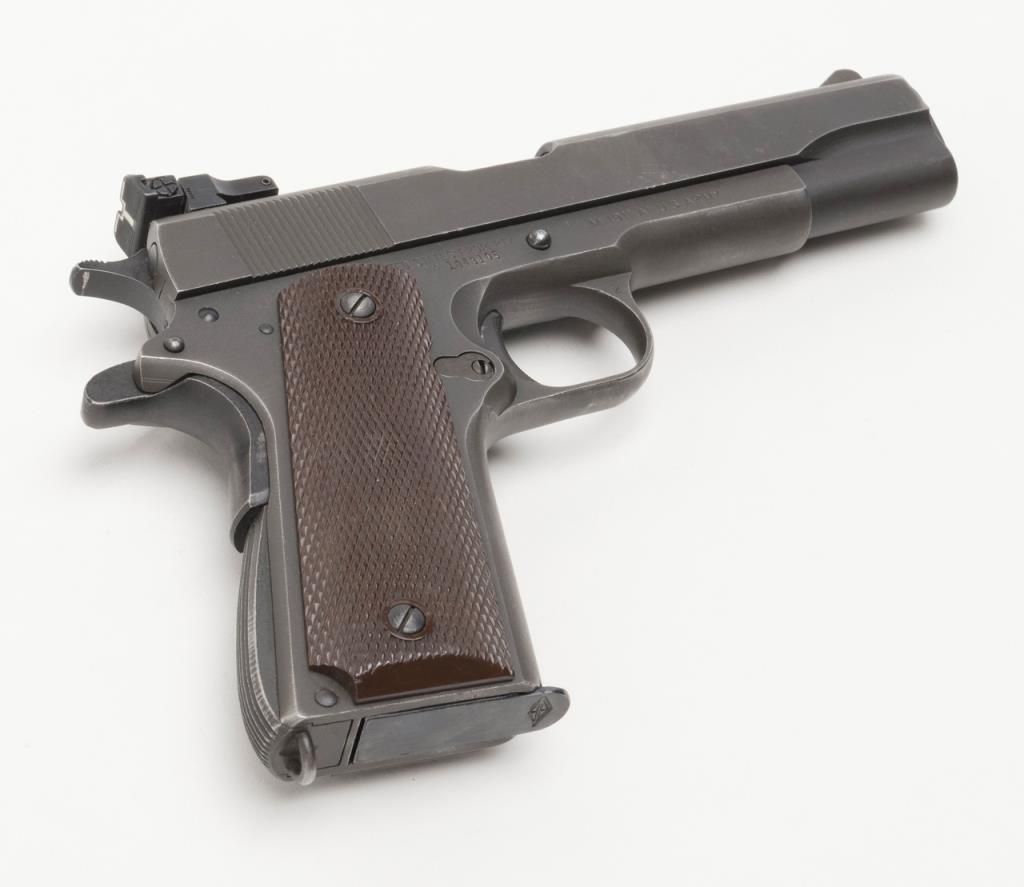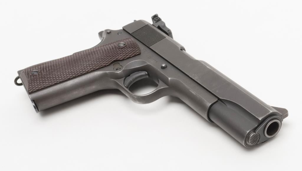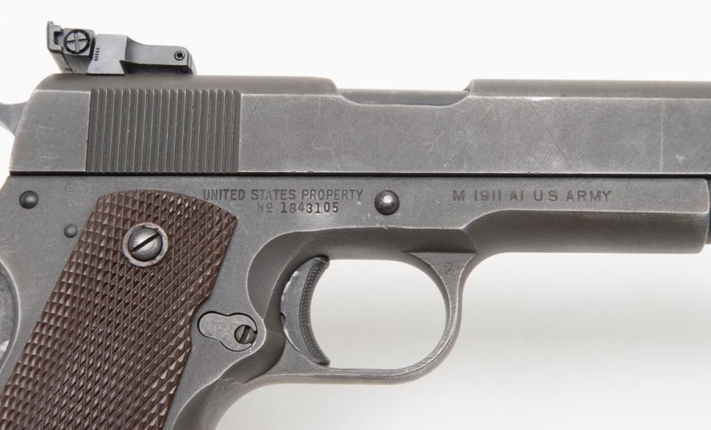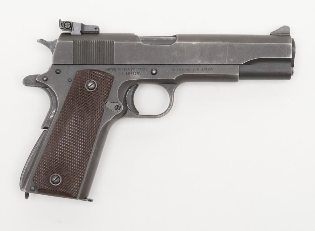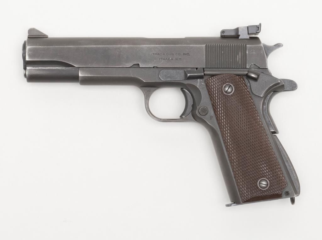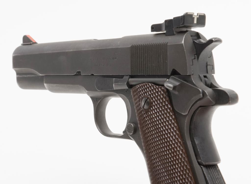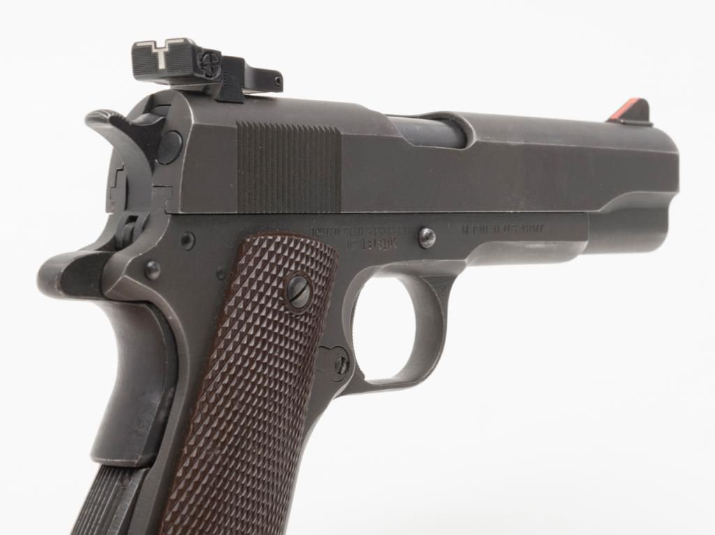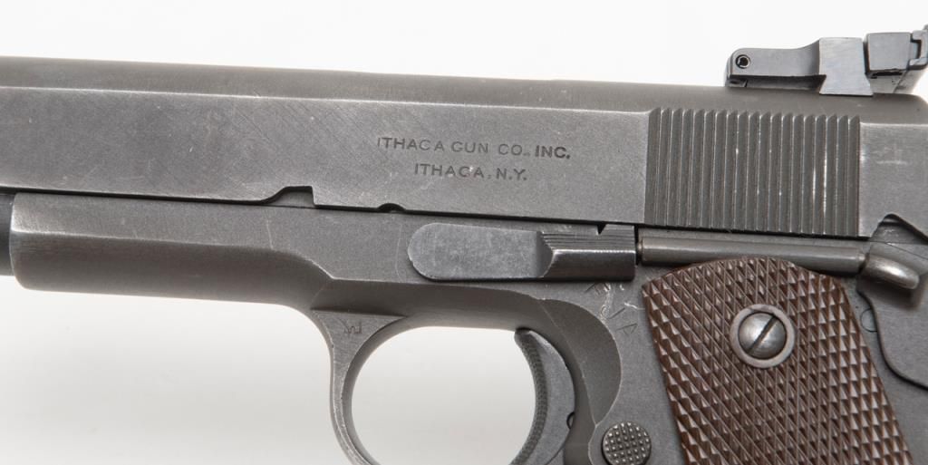 U.S. Property-marked Model 1911-A1 semi-auto pistol by Ithaca, .45 cal., 5” barrel, parkerized finish, checkered maroon plastic grips, #1843105 in overall very good + condition showing considerable military finish with holster and high point wear, good bore, crisp action and markings, very good grips, later added target sights. (C&R/PPT). Est.: $700-$1,400.