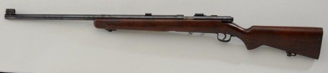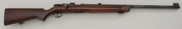 U.S. Property-marked Stevens Model 416 bolt-action target rifle, no magazine, .22LR cal., 26” heavy X barrel, blue finish, wood stock with sling swivels, scope mounts and hooded front sight, #200093 with flaming bomb proof. This gun is in overall good condition showing considerable muted blue finish , very good bore, crisp action, very good markings and very good wood stock with some scattered old mars from storage. Est.:$150-$300.