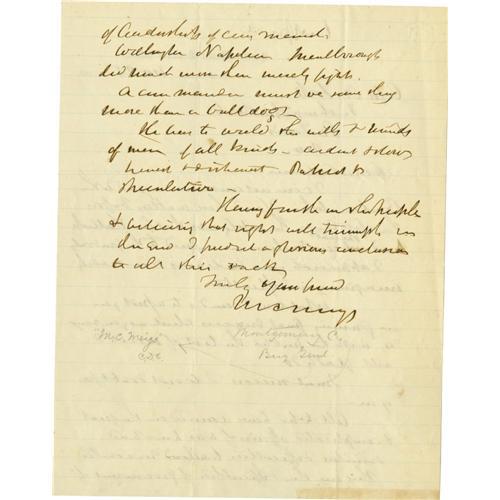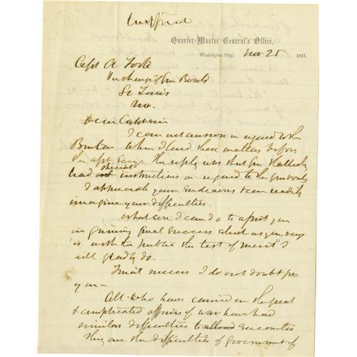 <B>U.S. Quartermaster General Montgomery C. Meigs War Date Autograph Letter Signed</B></I> "<I>M.C. Meigs</B></I>". 1½ pages, 7.75" x 10" lined "Quarter-Master General's Office" letterhead, Washington, November 25, 1861, to Captain Andrew H. Foote, a naval officer then in command of the Mississippi River Squadron. He writes, in part: "<I>...I appreciate your endeavors & can readily imagine your difficulties. Whatever I can do to assist you in gaining final success which you say 'is with the public this test of merit' I will gladly do. Final success I do not doubt for you... Wellington Napoleon Marlborough did much more than merely fight. A commander must be some thing more than a bulldog. He has to weld the wills & minds of men of all kinds... Having faith in the people & believing that right will triumph in the end I know a glorious conclusion is within reach. </B></I>" Montgomery Cunningham Meigs was a career army officer who was appointed quartermaster general just after the start of the war and served in that capacity until his retirement until 1882. Andrew Hull Foote, a career navy man and staunch abolitionist, was promoted to rear admiral in 1862 and died in 1863 of wounds suffered while collaborating with Ulysses S. Grant in the capture of Forts Henry and Donelson and Island No. 10. Fine condition.<BR><BR><b>Shipping:</b> Flat Material, Small (<a target="_blank" href="http://www.heritageauctions.com/common/shipping.php">view shipping information</a>)